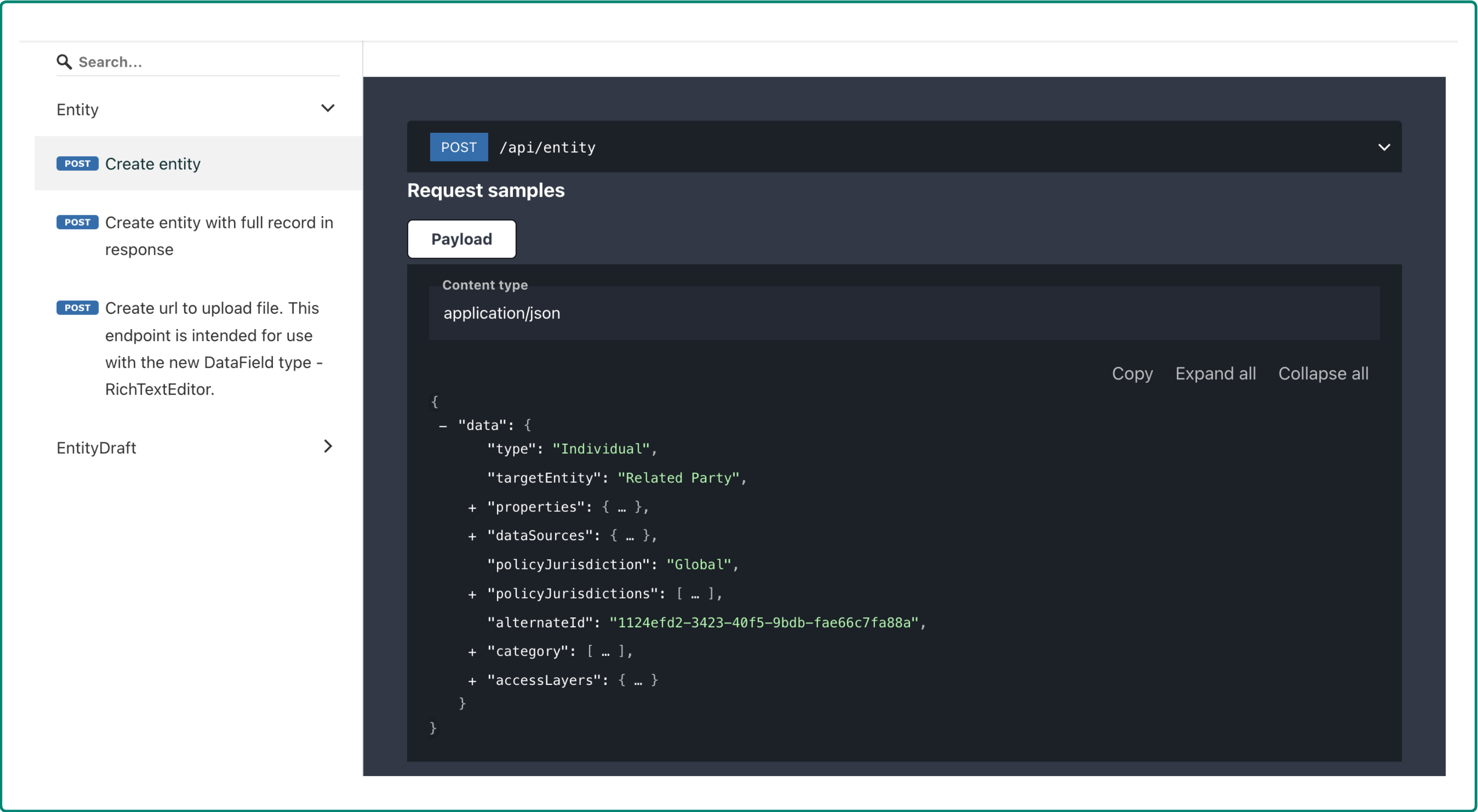 Within the menu on the left hand side you will see multiple subfolders which correspond to the different domains within the Fenergo SaaS platform. Each of these domains contains Command and Query APIs (where supported) and are grouped by version. All of the API Specifications are labeled as API-XXXX such as API - Entity Data Command. Clicking on each will load the API spec in REDOC so it can be easily read and explored as illustrated below.