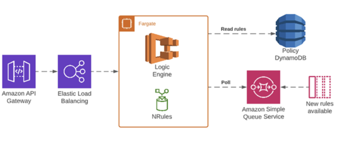 NRules library has been optimized to execute the rules at light speed using the rete matching algorithm. This is a pattern matching algorithm for implementing rule-based systems and was developed to efficiently apply rules or patterns to many objects, or facts, in a knowledge base. However it has one significant drawback - the rules compilation speed is quite slow. The time required to compile the rules increases exponentially with the growing number of the rules in the engine. With this in mind, we decided to host our engine API on the AWS Elastic Container Service, which would load and compile the rules once upon startup (or on-demand, when a new version of rules is available) and hold it in the memory as long as possible. The ECS would be exposed using Elastic Load Balancer, simple as that!