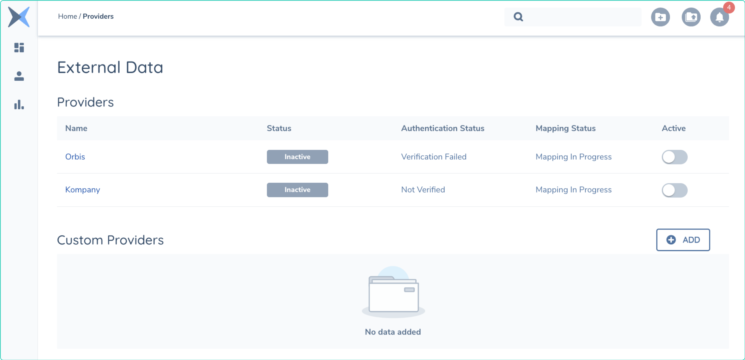 Fenergo comes with the both Orbis and Kompany External Data Providers available (but not configured) out of the box. Clients wishing to use these providers must provide their own account details for the relevant provider to enable these data sources. The default view of the External Data Configuration page on the Fenergo SaaS platform is as below. Illustrating both OOTB providers and NO custom providers configured.