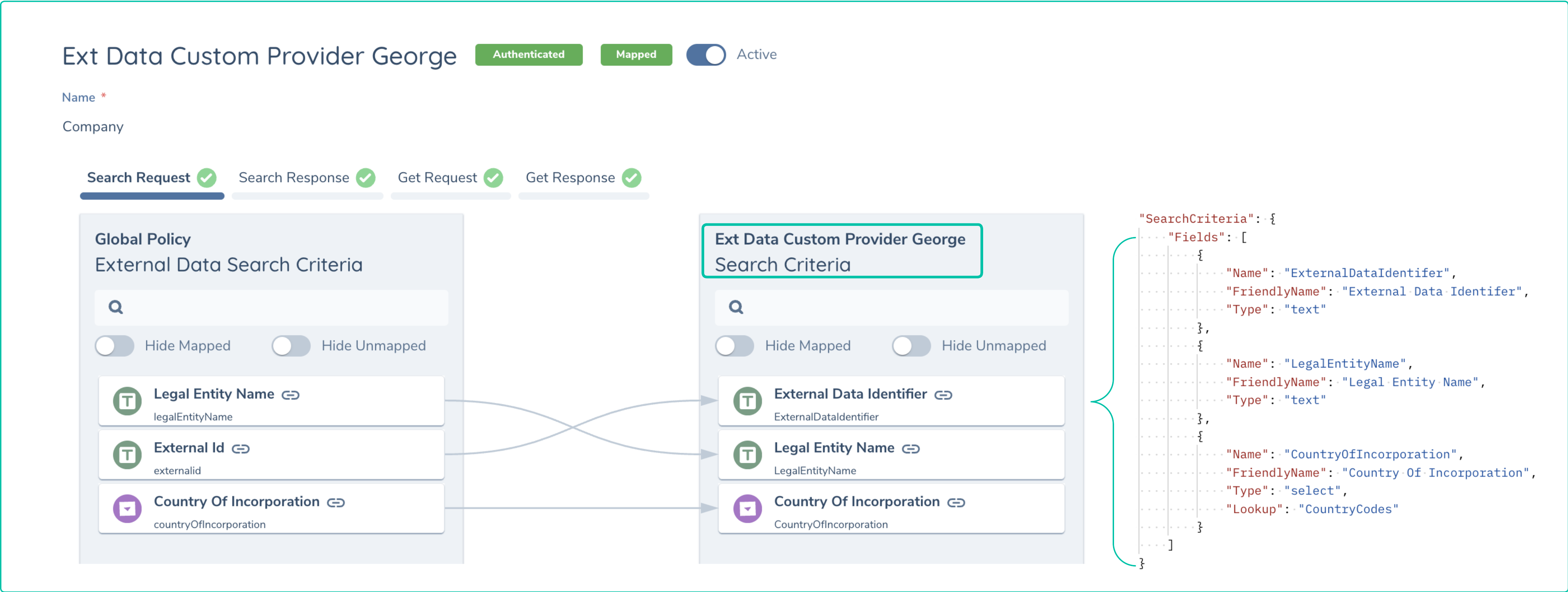 - Configure Mapping on Fenergo: Once the schema has been received by Fenergo, users can then use the admin screen to configure the mapping between the Fenergo Policy and the supported External Data for the various actions supported by the adapter.