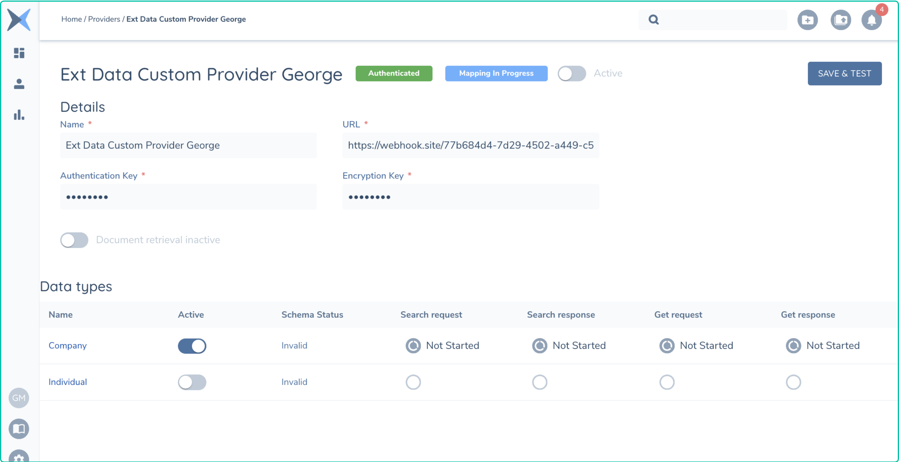 - Create Provider: The Fenergo SaaS Platform has an admin area where a new provider can be created. This will allow you to supply the URL where the adapter is located along with the Encryption and Authentication Keys required to secure the communications. Once entered, a Save and Test button will issue a Test message to the URL you have provided.