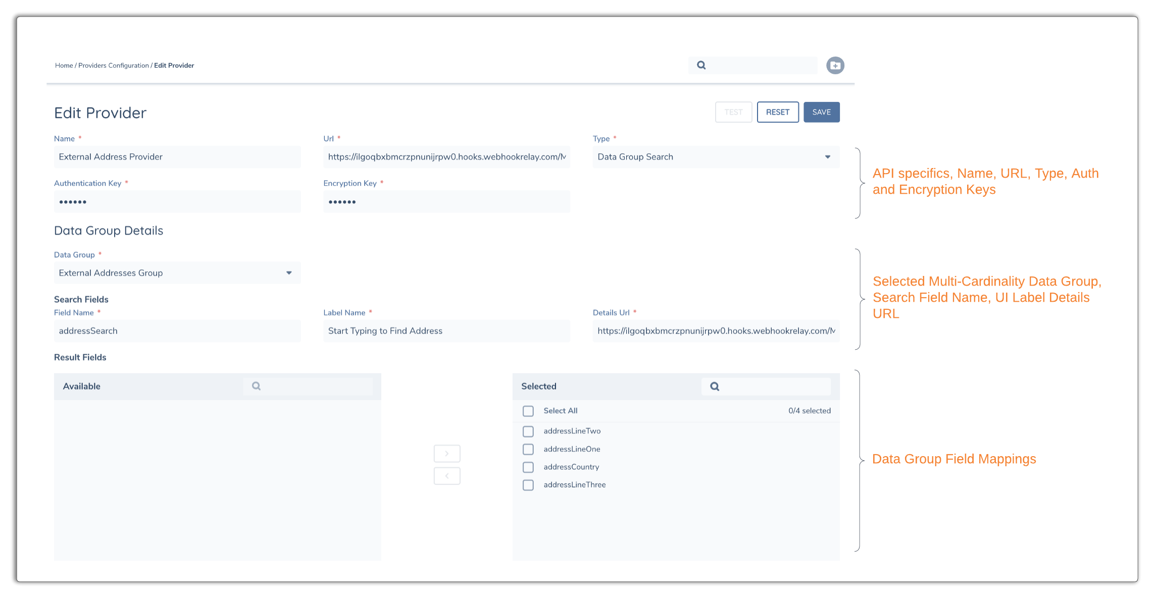 For comparison with the API look at the screen in the Admin Section of the Fenergo UI. You can see the elements that need to be set, along with the two URLs to both the Search and Details endpoints.