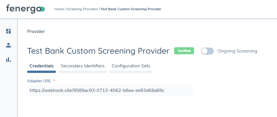 Once you have sent the above encrypted message back to the Fenergo Receptor, if you navigate to your screening provider config, you will see the status is labelled as Verified