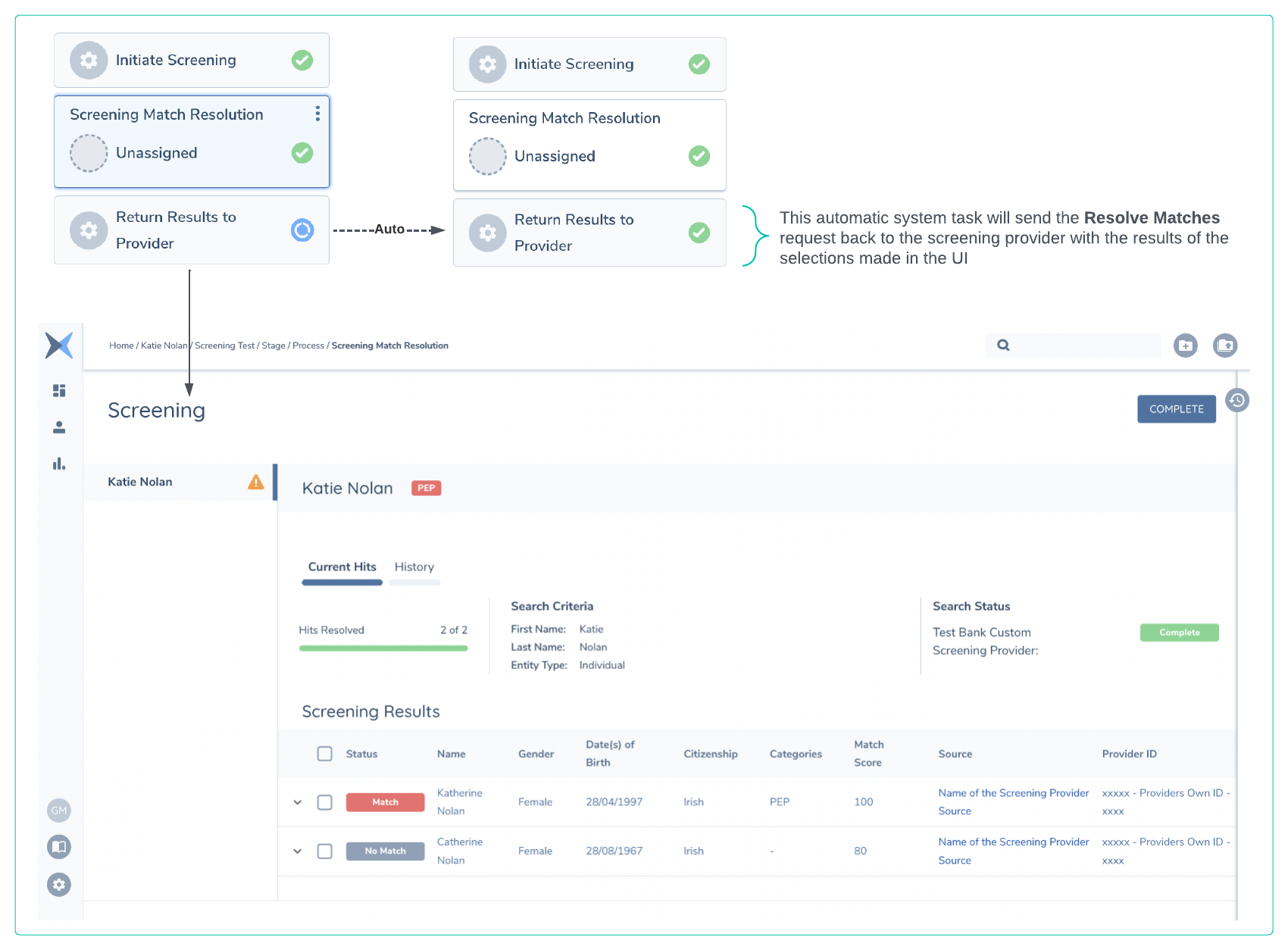 • Screening Task is Complete. The automatic task will send a Resolve Matches request to the adapter with the results of the screening activity from Fenergo.