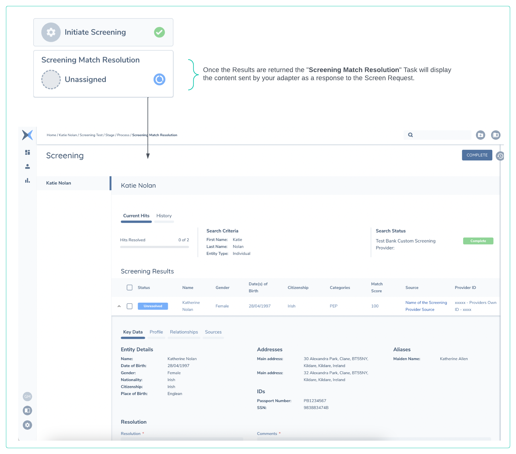 Once the custom screening adapter has been configured in Fenergo (and tested) it can then be used from within Journeys. What this means is that when a Screening Task is configured in a journey, Fenergo will send a Screen Request out to the configured providers. A correctly configured client implemented custom adapter will need to be capable of the following: