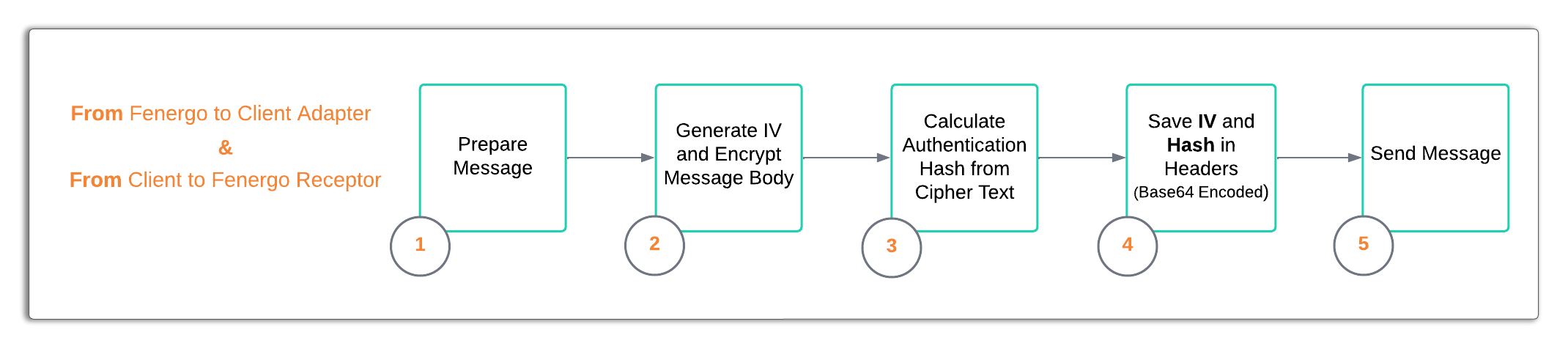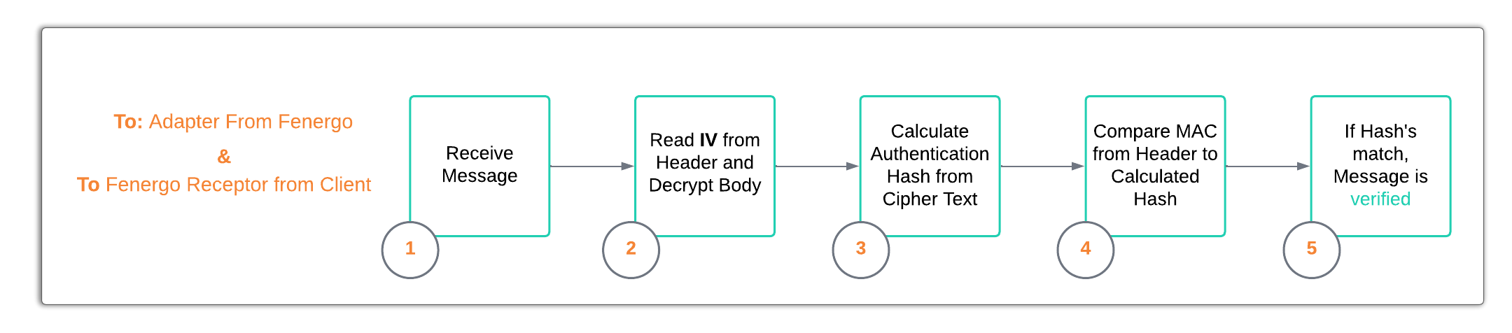 How the encryption and decryption are implemented is important to understand as Fenergo will call to a client adapter with the message body encrypted and authenticated. The client adapter must follow the Decryption Steps to read the messages and verify it originated from Fenergo. The client must then send the responses back following the same Encryption Steps. These steps are illustrated below at a high level and covered in detail within the API walkthrough.