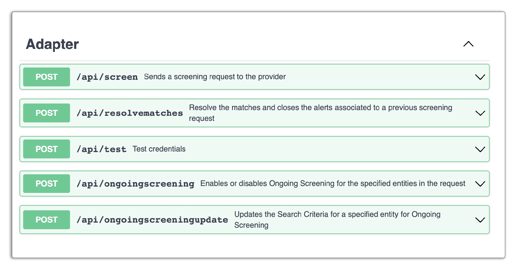 What this means from a client / consumer perspective is that your Adapter Implementation must adhere to this same pattern and implement all the methods outlined in the Screening Adapter Contract above.