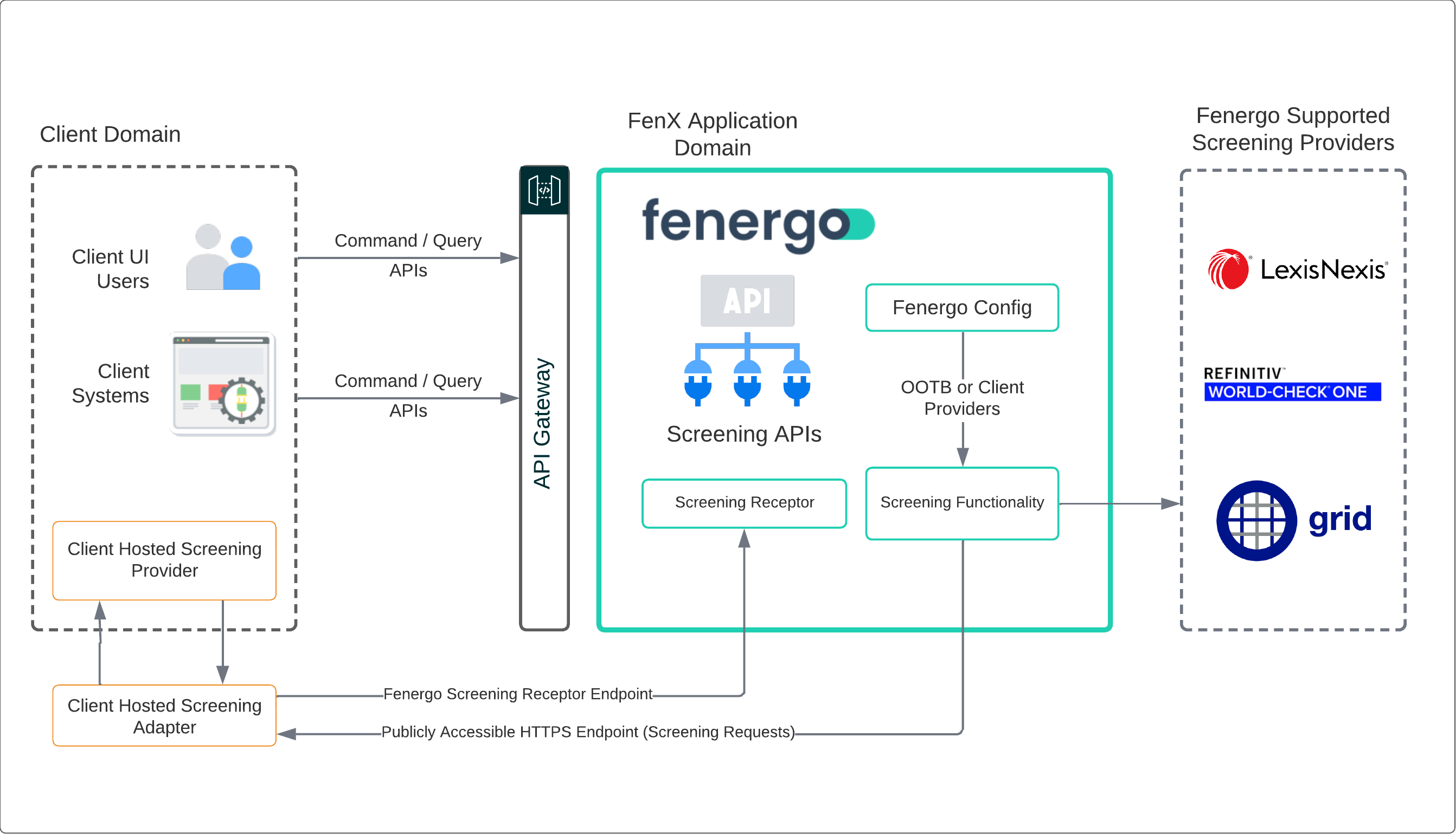 Below is a high level overview of how the External Adapter Pattern is implemented, including all the components and how they interact together. If consumers have configured one of the Out of the Box Providers, then the Fenergo SaaS platform connects to that provider. Consumers can choose to implement a custom provider by creating and hosting a screening adapter of their own which conforms to the specification outlined in the Adapter Contract. Fenergo can then call that adapter and interact with a custom Screening Provider. Where callbacks are required, these are done via the Screening Receptor API endpoint. Further details are available in the Open API spec below.
