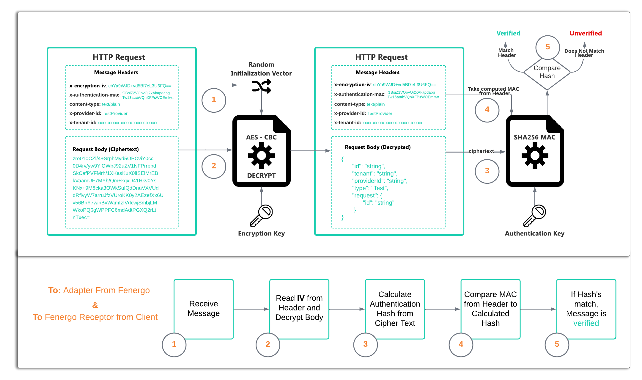 Your adapter implementation (or wherever you relay the messages to if your interface is acting as a proxy) must implement the ability to Decrypt and Authenticate messages received from the Fenergo Saas platform. The process for decryption is illustrated below, all languages support AES and HASH algorithms
