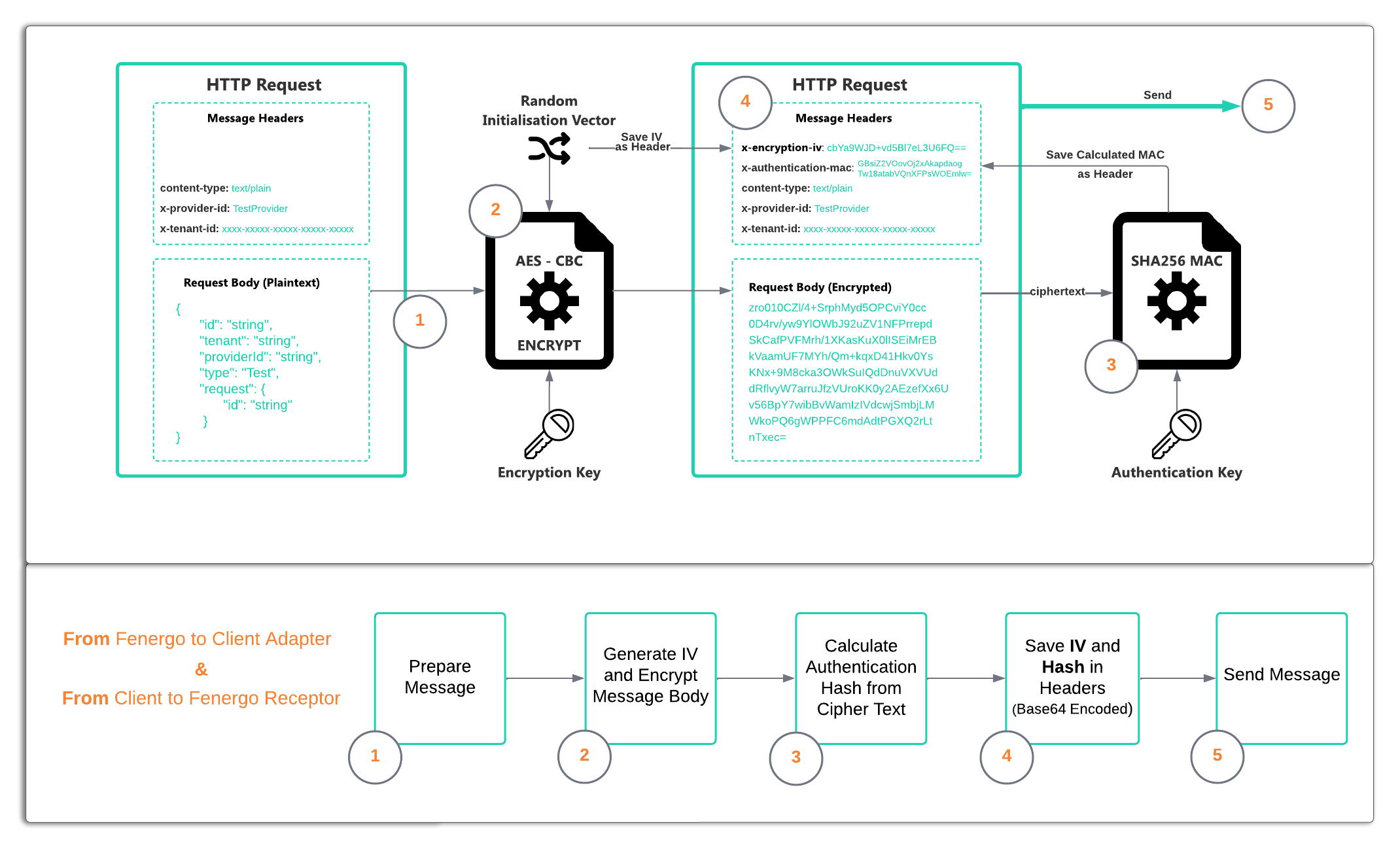 To protect the content of data sent to an External Adapter, The message body content is first encrypted using the AES-CBC Algorithm. This uses both an Encryption Key along with a random Initialization Vector (IV). A separate Authentication Key is used to calculate a hash on the encrypted message body. The random IV and the Hash are sent along with the message as a header. This allows the message to be both decrypted and then validated as coming from a trustworthy source.