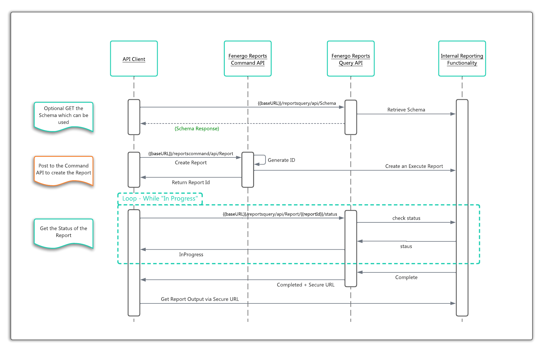 - Poll for Status Illustrated in the sequence diagram as a loop, the calling application will receive a message with the status of In Progress until the report execution is finished. At that point this method will return a CompletedStatus along with a URL where the report can be downloaded (The report is in CSV format).