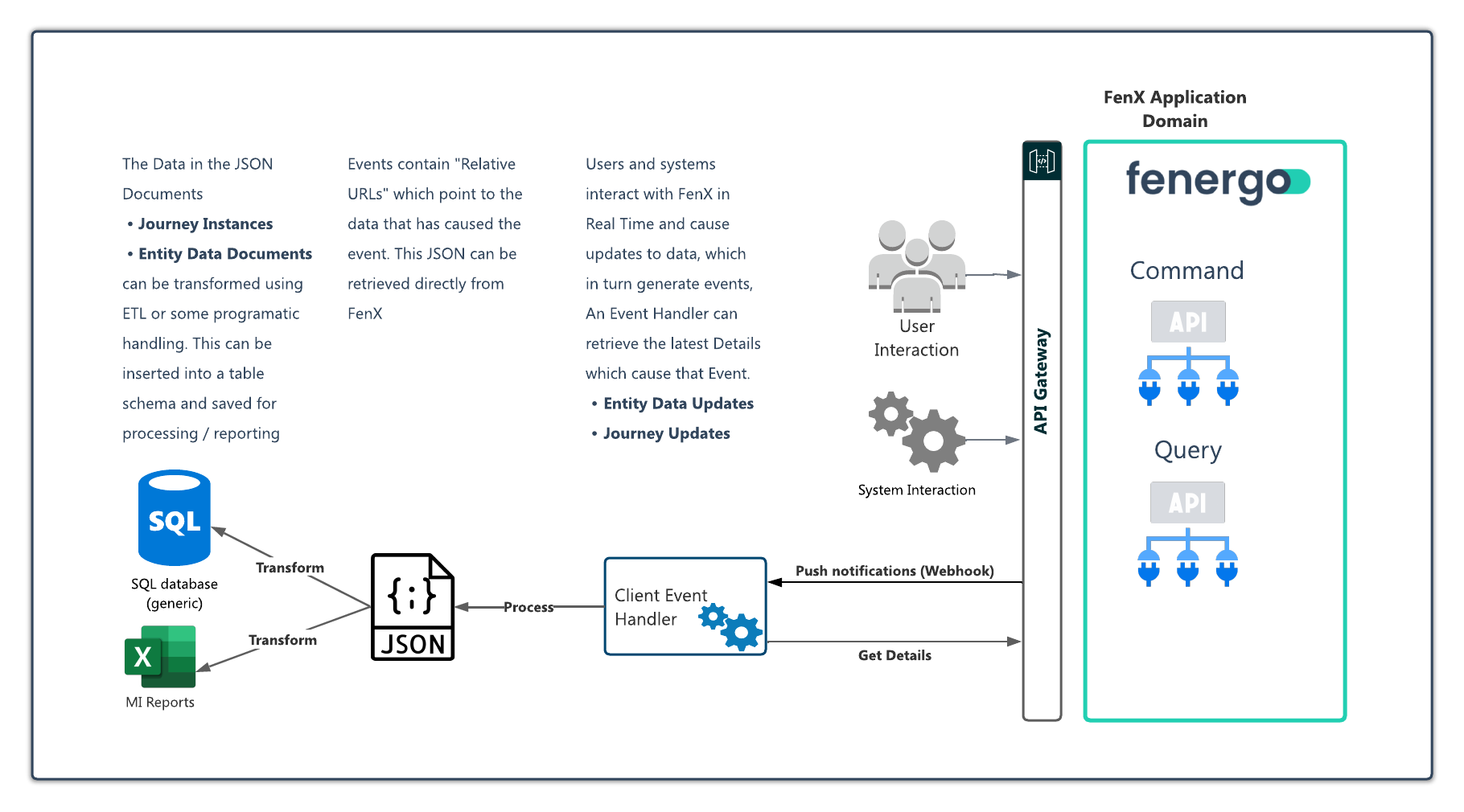 Typically all the fenergo SaaS Platform clients have reporting requirements which depend on extracting the data managed by our SaaS platform. AS a multi-tenant SaaS solution, we do not provide direct access to underlying data sources. As per standard SaaS principals, Fenergo take on the responsibility on managing and securing the data sources for all clients. That data is securely distributed across domain specific data stores in line with the Domain Driven Design pattern and the platform offers its functionality with features which interact across all of these domains.