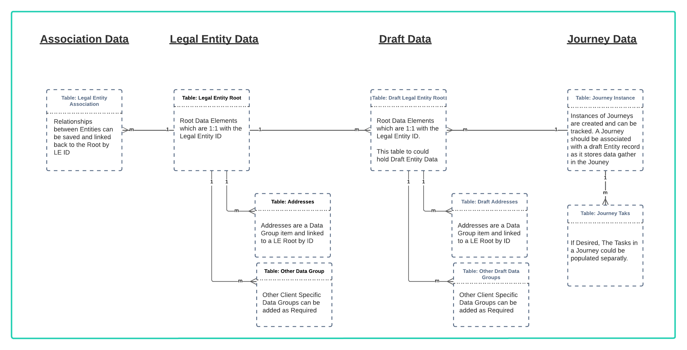 A Table schema is the structure used to store data in a Database. Because clients configure the the fenergo SaaS Platform Policies to their own requirements there is no single schema which covers the full relational structure, as this would be dependant on that configuration. However there are some generic structures which hold true in terms of a standard data model. This is illustrated below. To then populate that schema, a client using polling or webhooks to monitor data changes can use JSON object responses from API calls and translate them into SQL Style Insert queries, then execute them in real time against their own local DB Schema to maintain an offline sync with the data on the Fenergo platform.