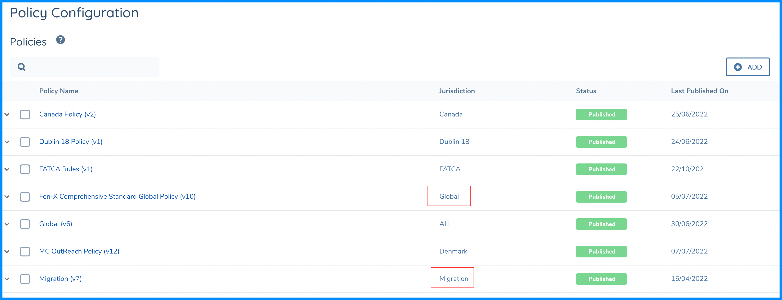As can be seen from the above illustration, there is a policy labeled as Global under the Jurisdiction column and also a policy labelled as Migration. We know that there is no such Jurisdiction called migration, but we are using the standard Policy Configuration functionality to specifically create a Policy that can be used exclusively for Data Migration.