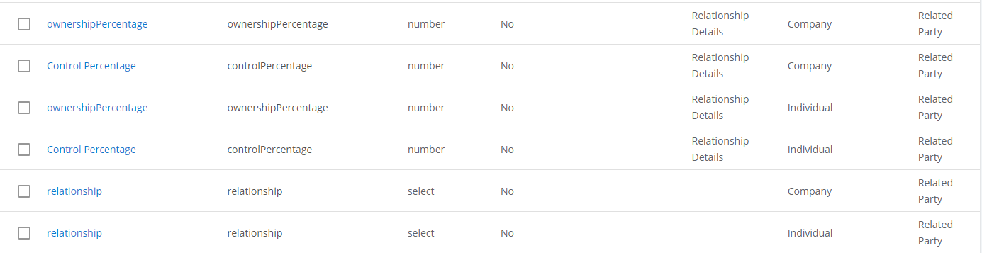 • ownershipPercentage - Category: Relationship Details | Target Entity: Related Party | Data Type: Number