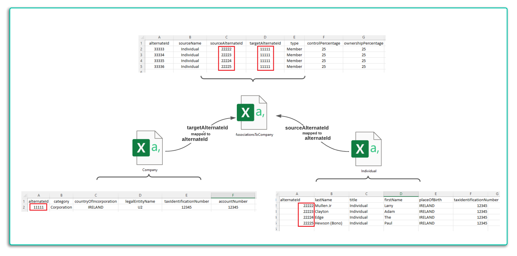 As per the Example with a Company Legal Entity called U2 above, the data to create this entity plus the related parties and then the associations is populated across three of the CSV artifacts as illustrated below. The objective is to create a Legal entity of type Company called U2, 4 Legal Entities to represent each of the band members and then an Inbound Association to U2 from Each of the Individuals.