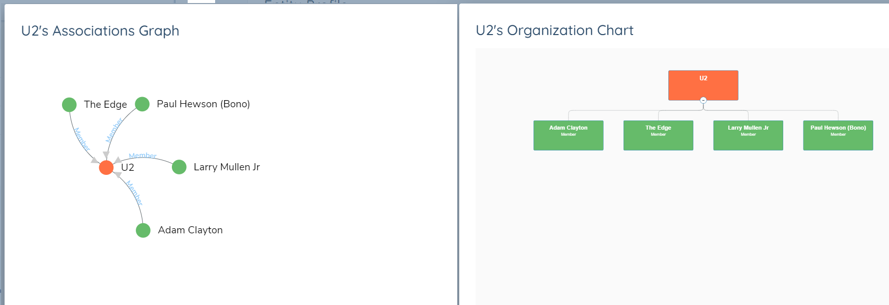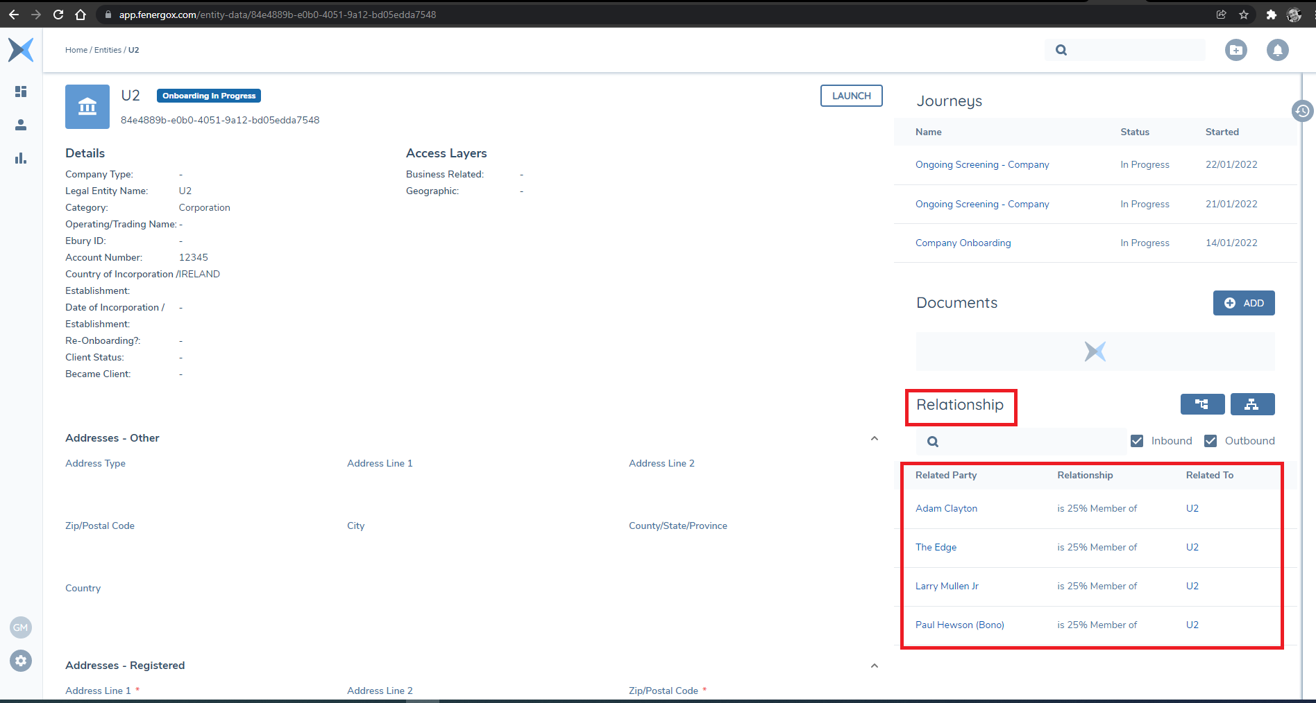 In the Example below a Simple "Root Legal Entity" representing the band U2 can be seen with relationships to the four band members. These are known as Inbound relationships and can verbalized as "The Edge is a 25% Member of U2".