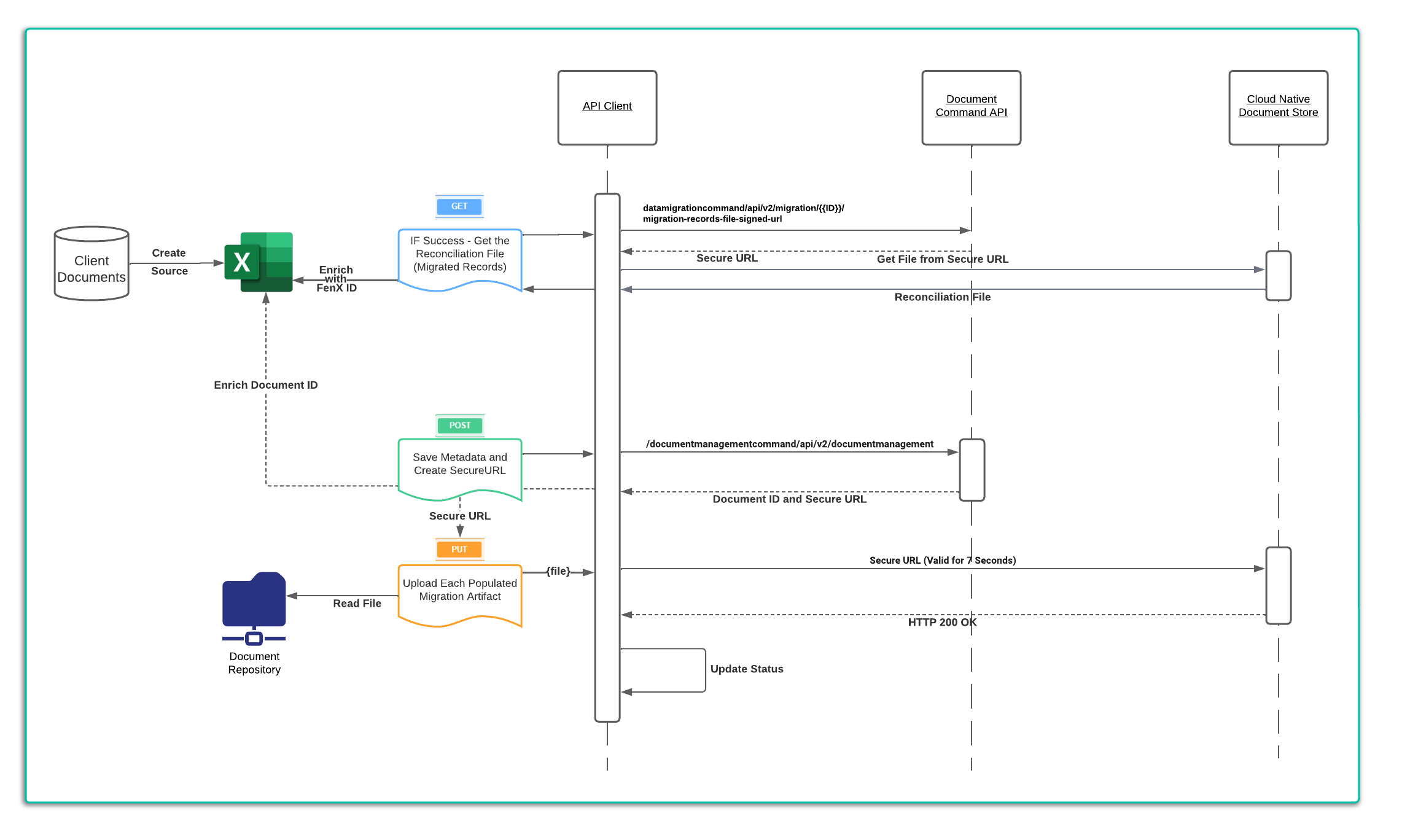 To satisfy this use case, a client will need to retrieve the "Migrated Entities" report from the Data Migration. Then using that data, enrich their source list of documents to be migrated. The sequence to execute the document migration is as below: