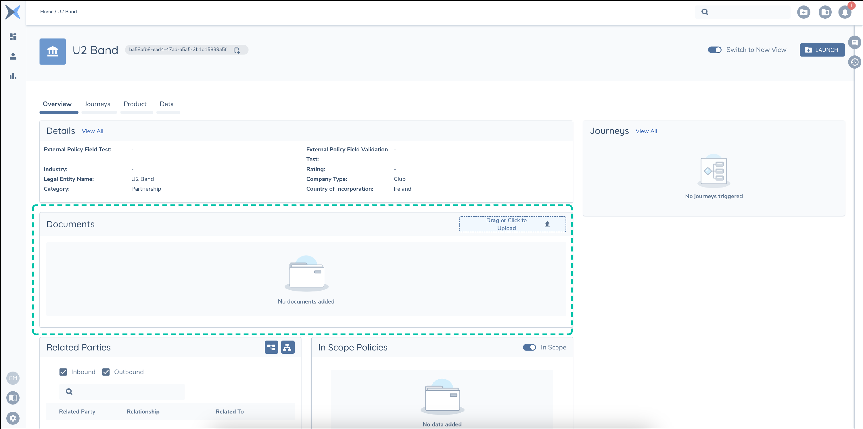 Unlike the data points or data groups in a policy, document requirements can be thought of as meta data relating to the document and a pointer to the physical document which is stored inside an S3 bucket. There is an association inside the FenX application which stores the relationship between the Legal Entity and the Document. This is transparent to clients but is how a document is displayed against Legal Entries and can be used to fulfil requirements within Journeys.