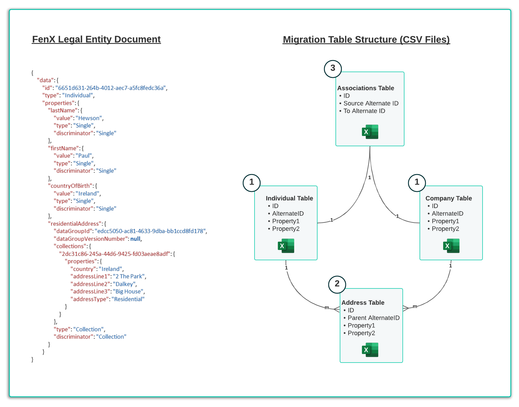 As illustrated above, Legal Entity Individual or Company data points which exist at the ROOT of the JSON document are added to the Individual or Company Table (CSV files). This data will get a the Fenergo SaaS Platform identifier when migrated, but clients need to supply their own Foreign Key identifier which is referred to as an Alternate ID.