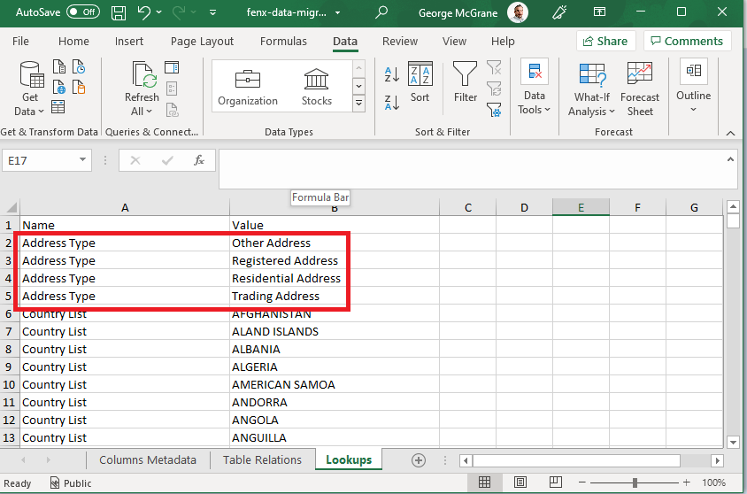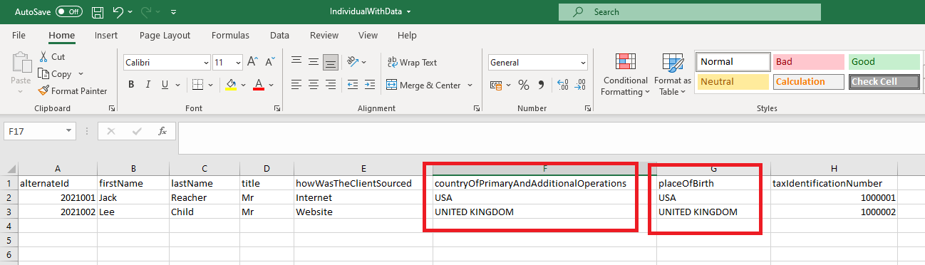 The Individual CSV has columns called countryOfPrimaryAndAdditionalOperations and placeOfBirth. Valid values have been added to the sample CSV above, these valid values came from the Lookups Tab in the "Schema" file, It indicated which lookup type needs to be used to populate the column. Clients may need to transform their data to these values before they migrate.