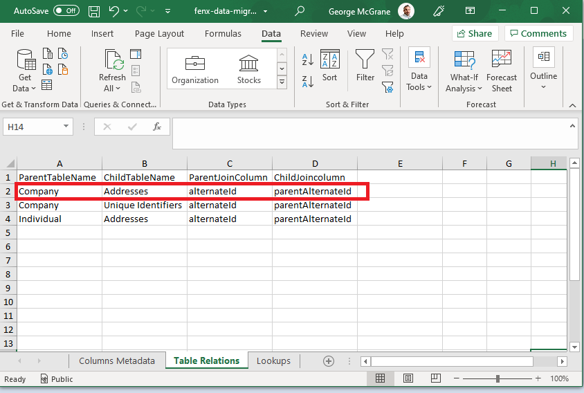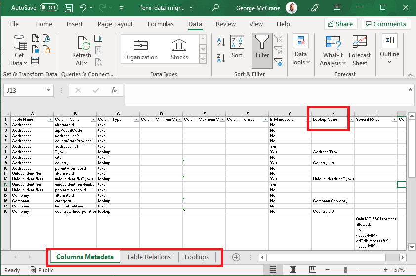 - Lookups The "Lookup Name" column (H) in the Metadata Tab identifies the lookup which is referenced. The valid values for all the lookups needed in the Migration are listed in this tab.