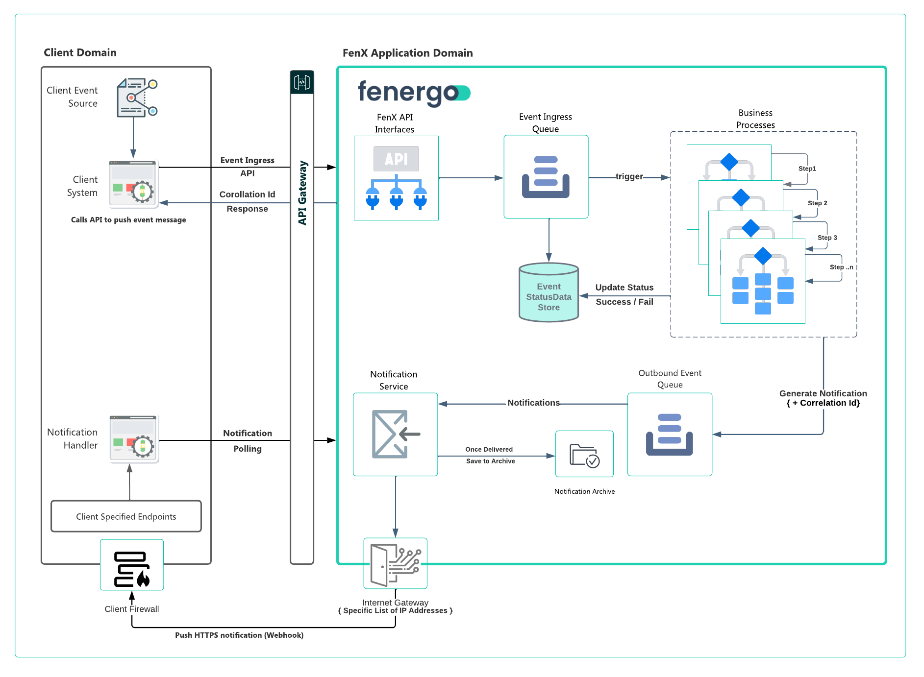 • Fenergo durably stores the event in EventStatus Data Store and queues the event message for processing.