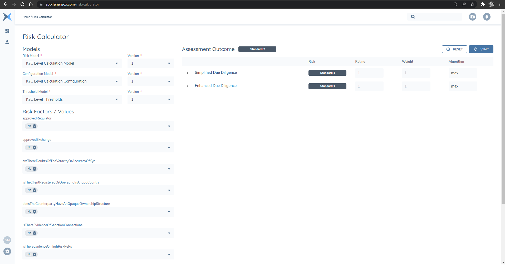 The FenX User Interface has a Risk Calculator where the Risk Model, Configuration Model and Threshold can be selected and tested. The UI will display the Risk Factors and allow a Risk Calculation to be simulated.