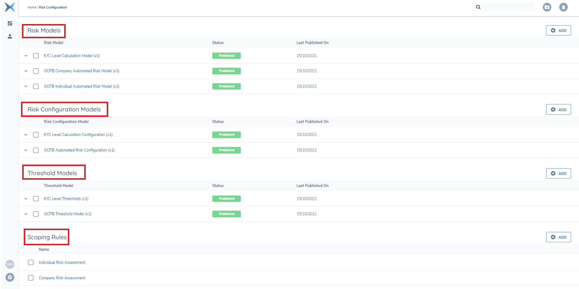 - Threshold Models - This is where the "Outcome" of a risk calculation is configured along with the "Next Review Date".