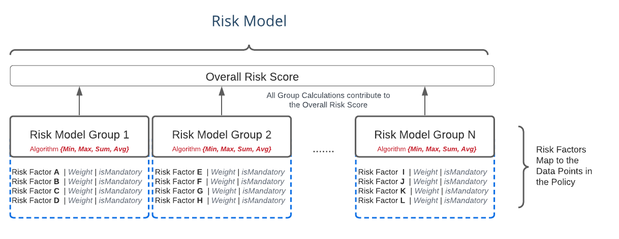 A Risk Factor is just a Data Point (from the policy) which is added to a group. Each risk Factor has a "Weight" which will be applied to the Algorithm from the group and a toggle which dictates that risk factor is mandatory or not. When all the Mandatory fields in a group are populated then a calculated value from the group contributes to the overall Risk Score, as illustrated below.