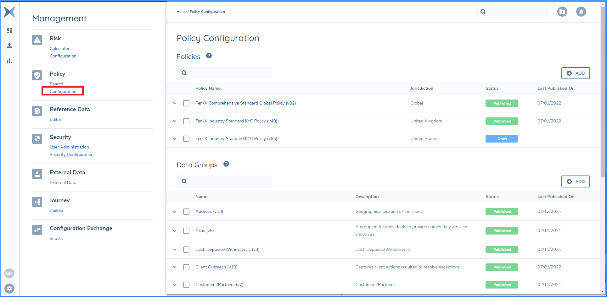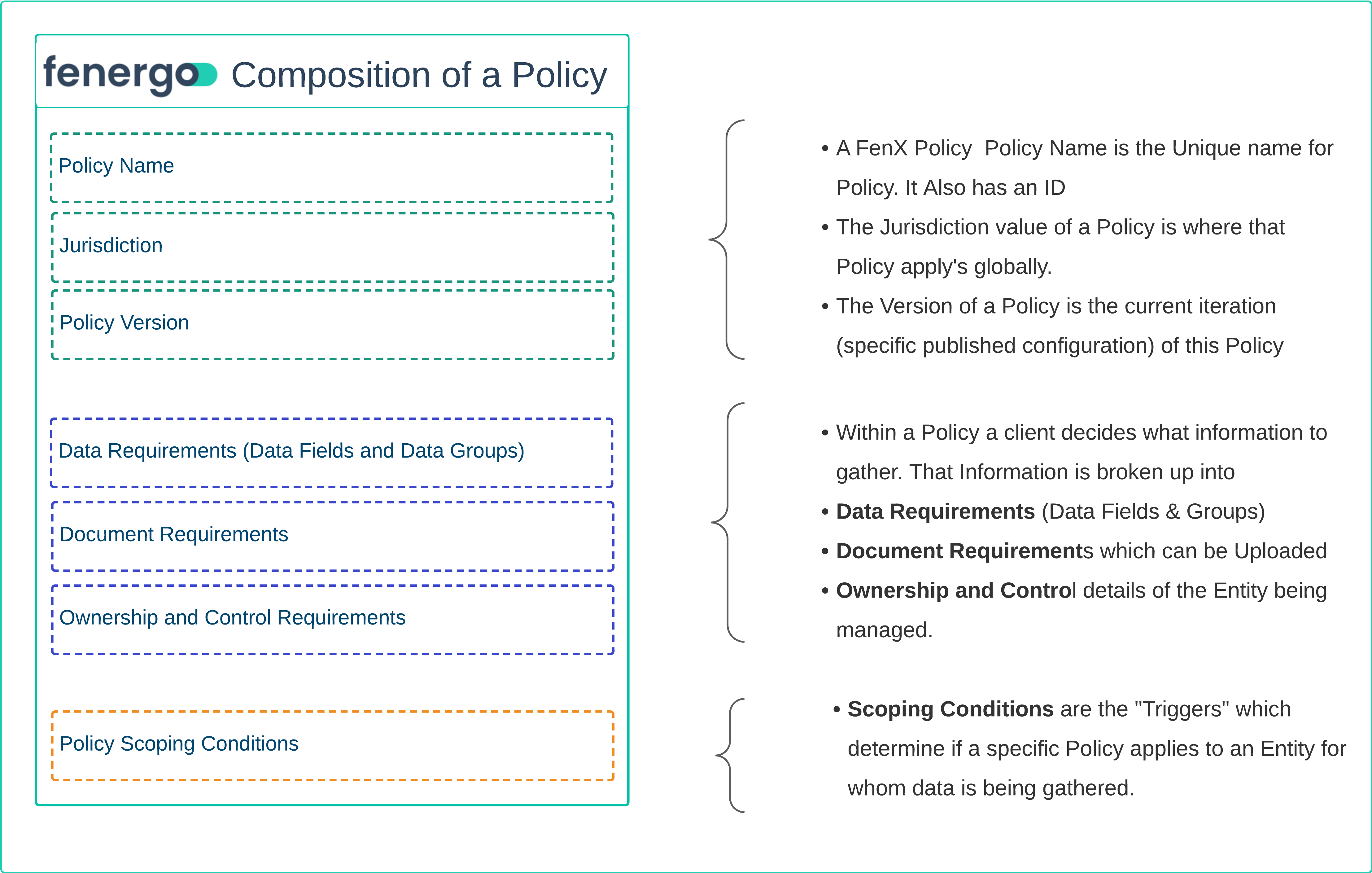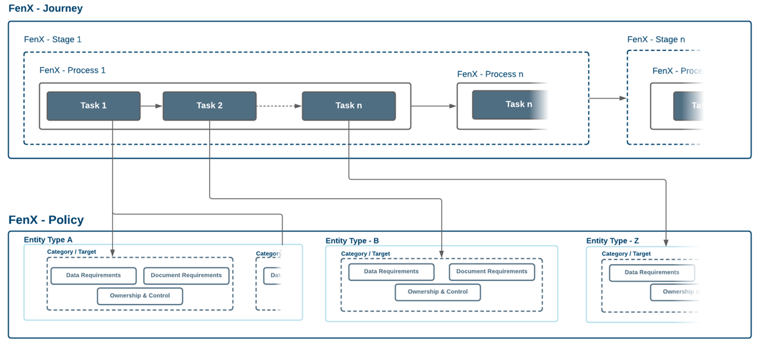 In the Fenergo SaaS platform a Policy is what clients create to define the Data Points / Ownership Details / Documentation they want to gather as part of their Client Lifecycle Management process. To draw a comparison against traditional system design, a Policy can be thought of as a Data Model or Object Model. In the same way as tables on a Database or objects in code are used to represent real world equivalents within a software system a FenX Policy represents the data which FenX users record when engaging with their clients.