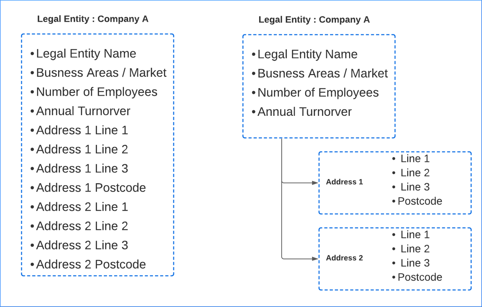 As can be seen below - the Difference between how Data is stored in a "Flat" Structure on the Left, versus a "Relational" Structure on the right. If a requirement to add a new address occurs, it can be done in a relational structure using an Address Data Group Instance on the right, where as in a Flat Structure it would require a Data Model Change.