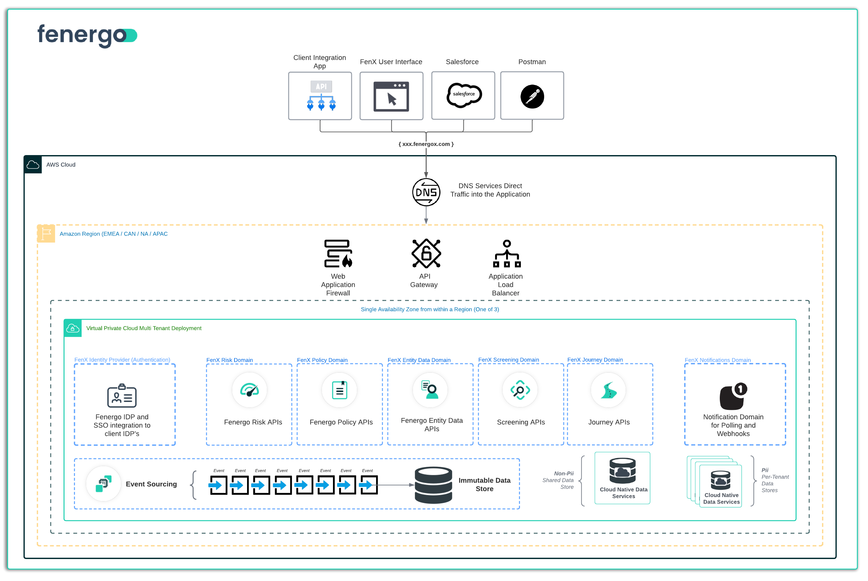 • Security and Networking: Using SaaS offerings from AWS, fenergo has selected security and networking components to ensure traffic is safe and balanced to available resources.