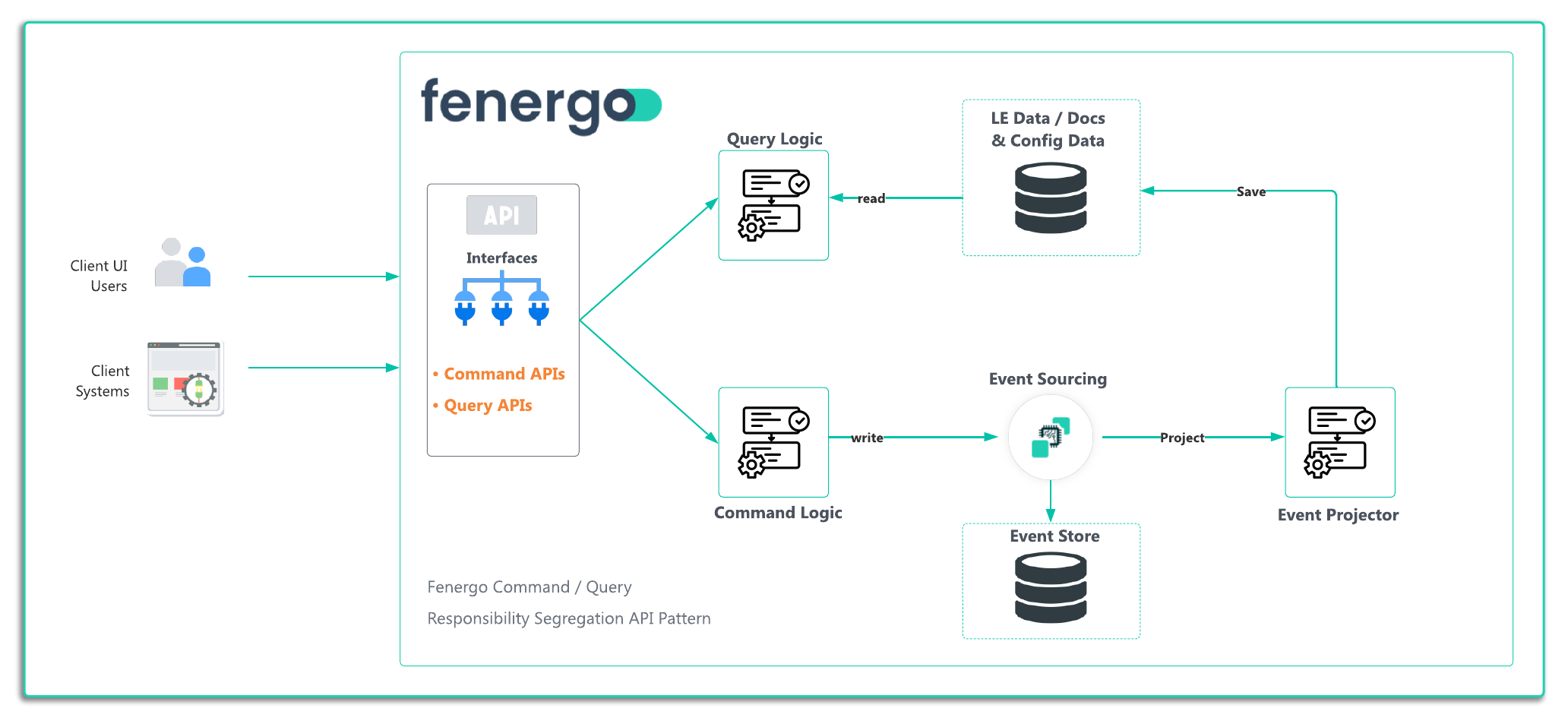 The majority of the APIs offered by the Fenergo SaaS platform conform to the CQRS (Command Query Responsibility Segregation) Pattern. The logical code execution paths through our application treat requests made to the Command API differently to those made against the Query API. As Illustrated below. Command APIs are used to change and update data where as Query APIs retrieve data. Whilst not intended to be a component level code path, the bellow illustration demonstrates how both command and query logic interact with separate code paths to achieve their outcomes. The Command Query pattern is implemented across all domains where it makes sense and in some cases more traditional APIs are in place (such as Event Ingress or SCIM).