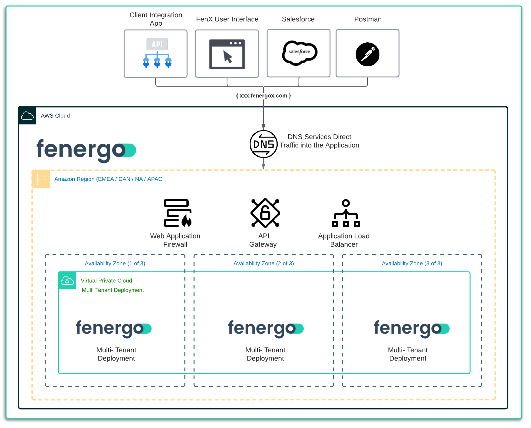 • DNS Services: Amazon provides a way for Fenergo to map the URL endpoints into the private hosted cloud space so when clients access main endpoints such as app.fenergox.com they are brought to the login / authentication portion of the application.