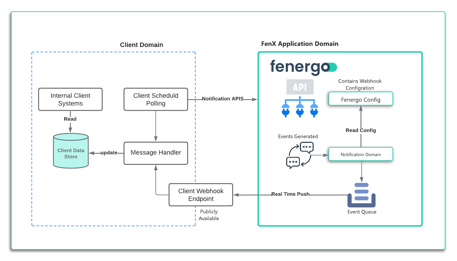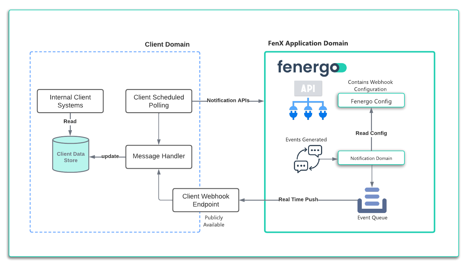 • Push Notification - Webhooks: Fenergo takes the message from the Queue and sends it to a specified client endpoint in real-time. Fenergo will consider a message delivered ONLY if we get a HTTP response of < 400.