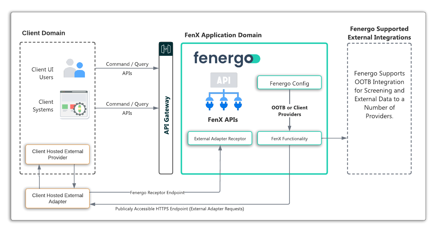 For clients who select to use external providers on Screening, External Data & Policy Data Fields, Fenergo supports client implemented custom adapters. Clients can register their Adapters through configuration on the the Fenergo SaaS platform UI or via APIs and then have our system call those adapters at run time to integrate with existing platforms. At a high level the architecture is illustrated below.