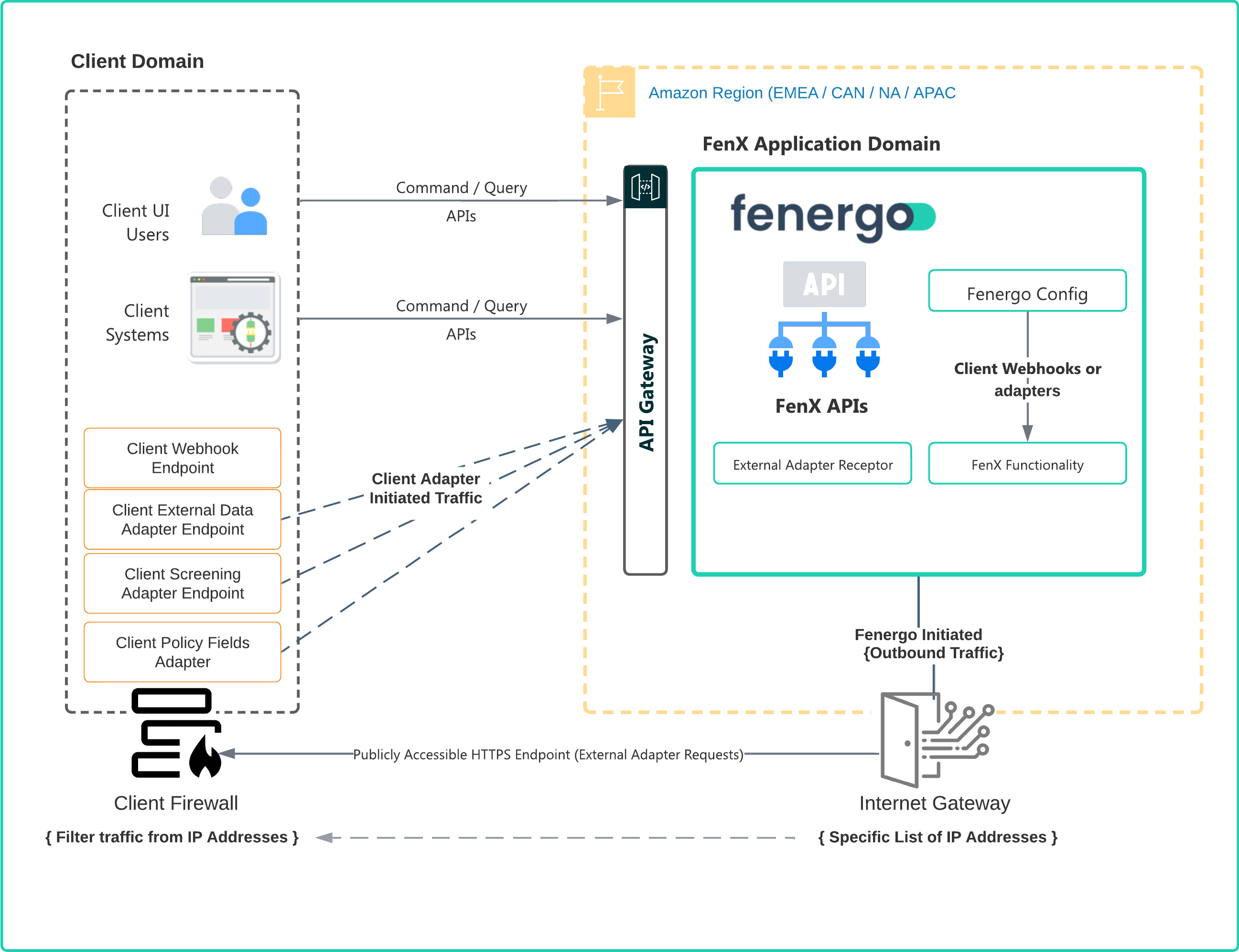 When the Fenergo SaaS platform initiates communication to a client specified endpoint, it sends HTTPS only traffic from a specific list of IP Addresses. As Illustrated below, this means that clients can add those IP Addresses to their firewalls / whitelists and explicitly allow HTTPS traffic coming from the Fenergo SaaS platform into their network (or whatever location endpoints are hosted). The IP Addresses differ from Region to Region and the list of IP Addresses can be requested from Fenergo via your project team, CSM representative or our Cloud Business Office.