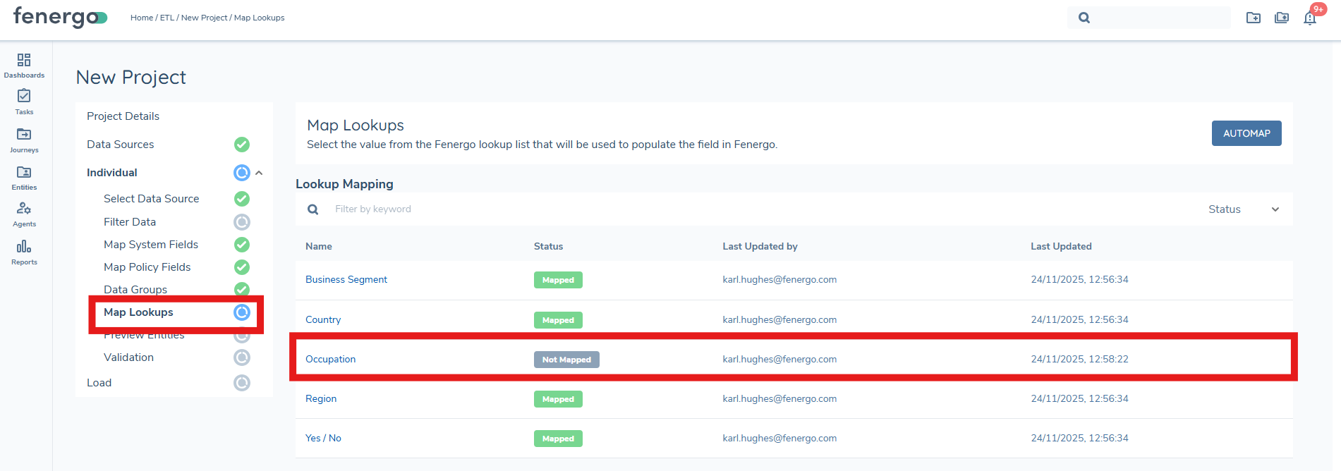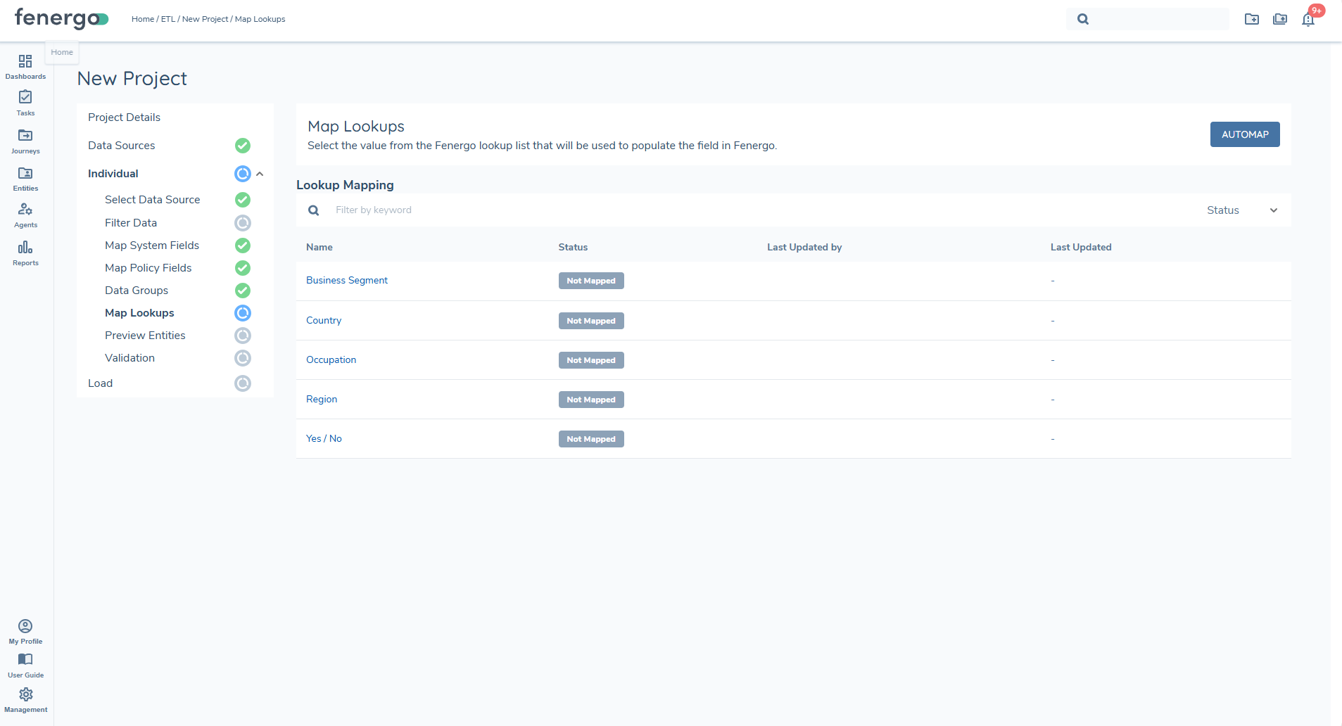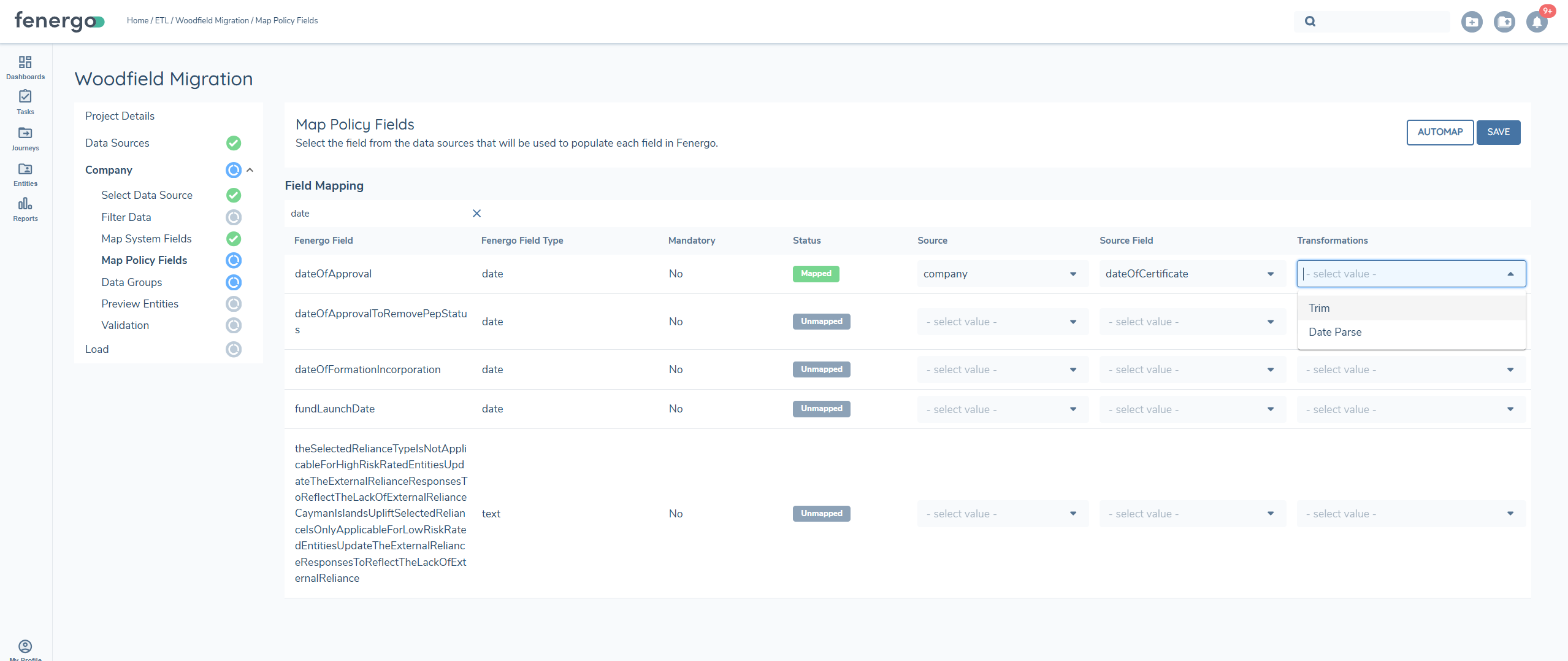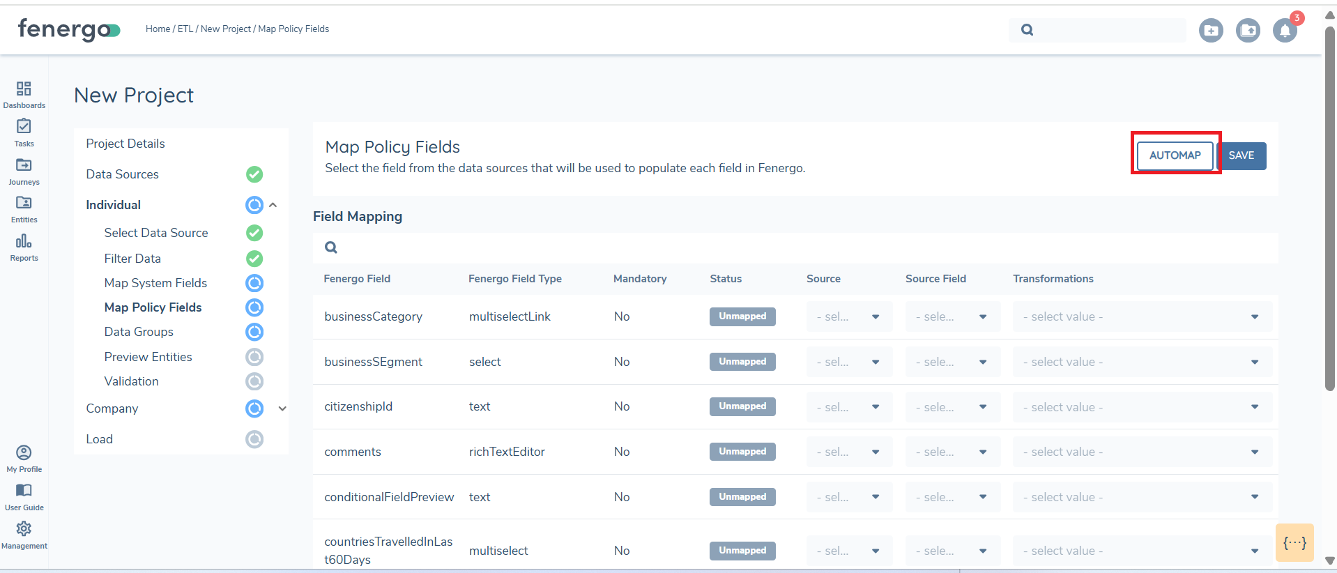 Each field in the data source can be mapped to a policy. The migration policy selected during ETL project creation will be used, and fields from the data sources can then be assigned accordingly. The "Automap" feature leverages AI to automatically map policy fields to the data source fields, but users must review these mappings for accuracy and there is a limit of 150 fields approx.