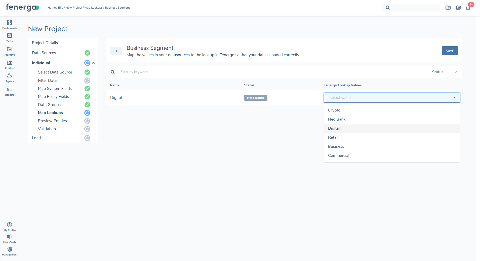 Once lookup lists are generated and displayed in the grid, users can begin mapping the values found in the data source to the corresponding lookup values configured in Fenergo.