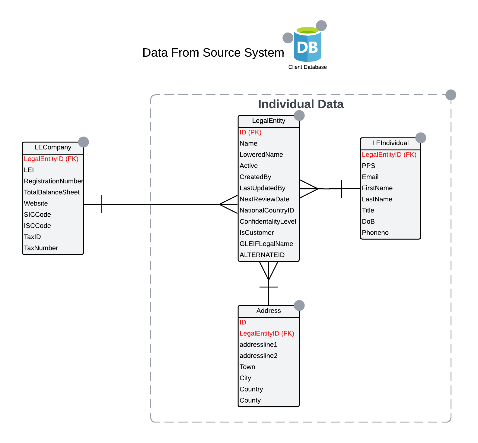 The LegalEntity table might serve as the Primary Data Source, containing core information about the entity. It will be used in both the Individual and Company data migration. Additional tables, such as LEIndividual, can be linked to the LegalEntity table through their primary and foreign keys. The primary key the LegalEntity.ID, is used to match with the foreign key LEIndividual.LegalEntityID.