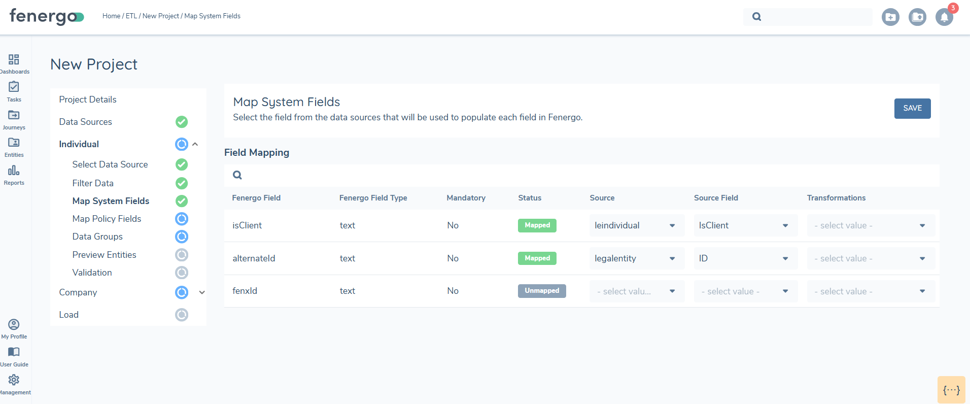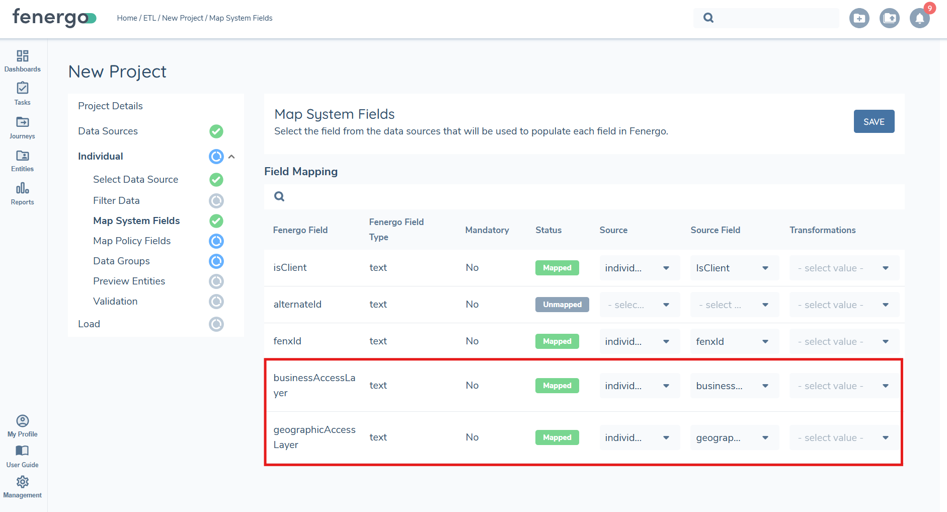 Once data sources are uploaded in the cloned project, all mappings, filtering rules, and joins will automatically persist from the original project. There may be additional fields that need to be mapped in the new version of the policy, these will display as 'Unmapped'.