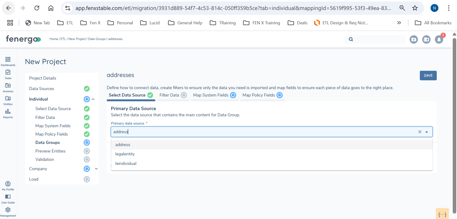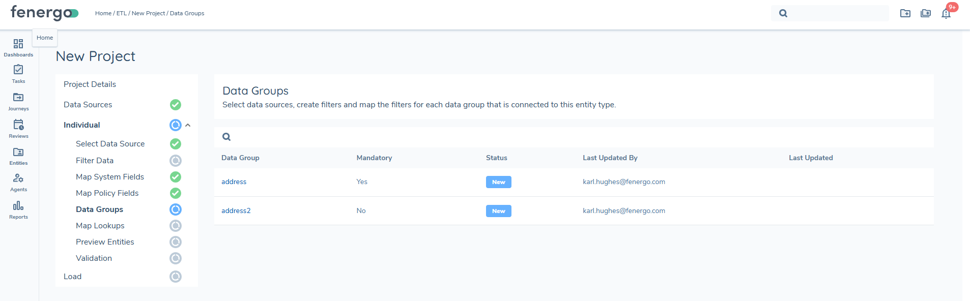In the Fenergo SaaS platform, a Data Group is a collection of data points used to represent a Sub-Entity, such as an Account or an Address. This is comparable to a link table in traditional data modeling, where an address references a parent record. When a policy includes any Data Groups, they are represented in the Data Group section of the ETL tool. Each datagroup entry must be linked to a parentID in the source file.
