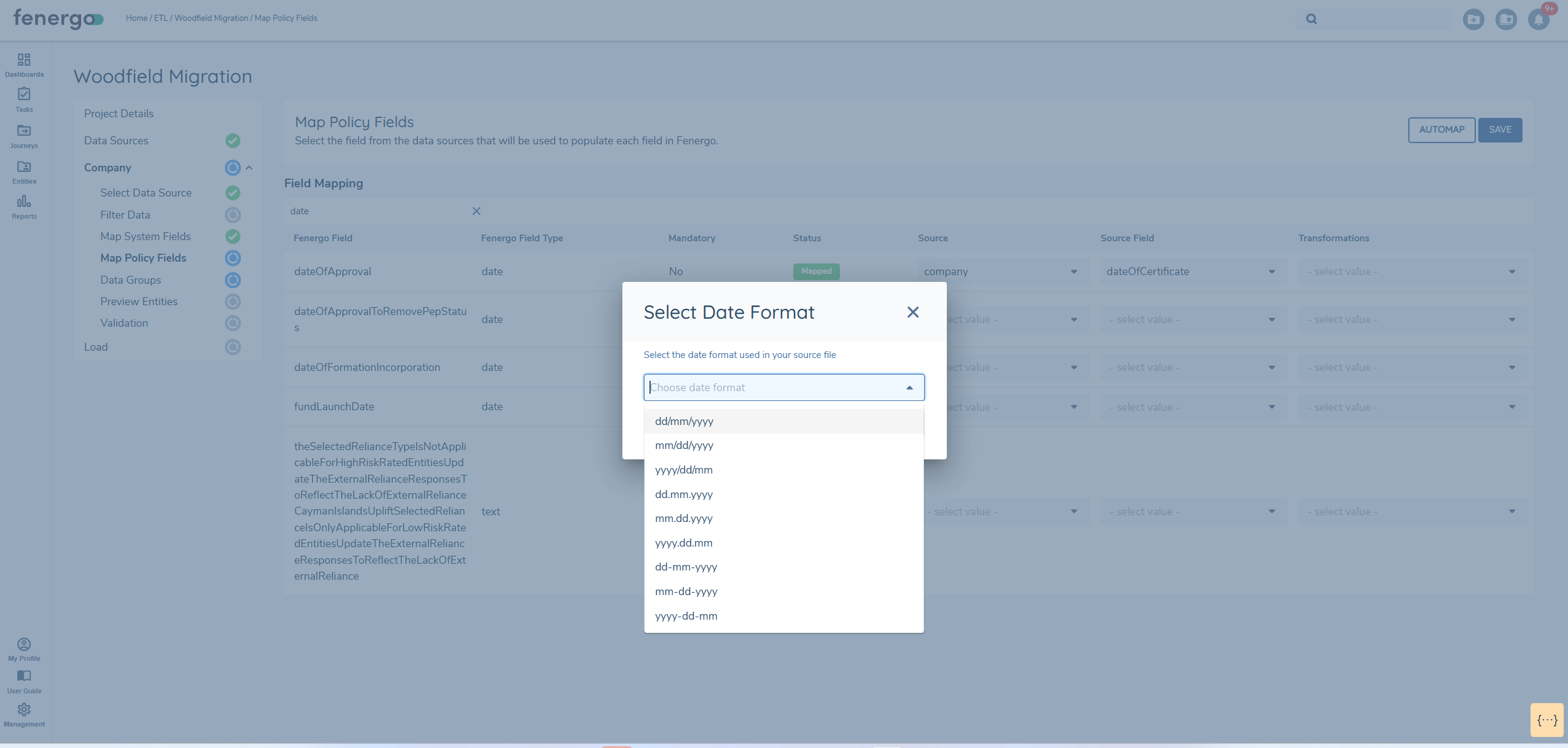 If your source file contains a date value that is mapped to a date field in Fenergo, selecting a date parse format is mandatory in order to proceed, as this will prevent validation errors.