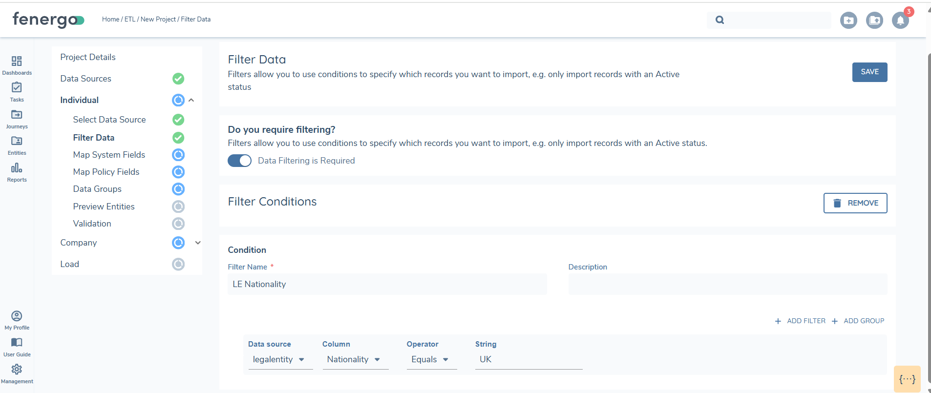 Filters can be applied to uploaded data sources to refine the data for validation and loading. You can set conditions by selecting a data source and applying filters. For example, if you want to view only entities with a nationality of the UK, applying this filter will allow you to work with just that subset of data from the uploaded source. When you move to the preview stage, only the filtered data will be displayed, validated and loaded.