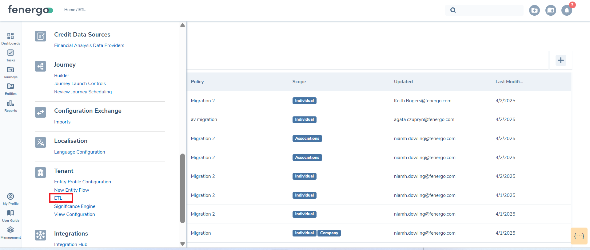To support the new ETL functionality, a new ETL Landing page tab has been introduced accessed by selecting ETL under the Tenant section in the left navigation menu.