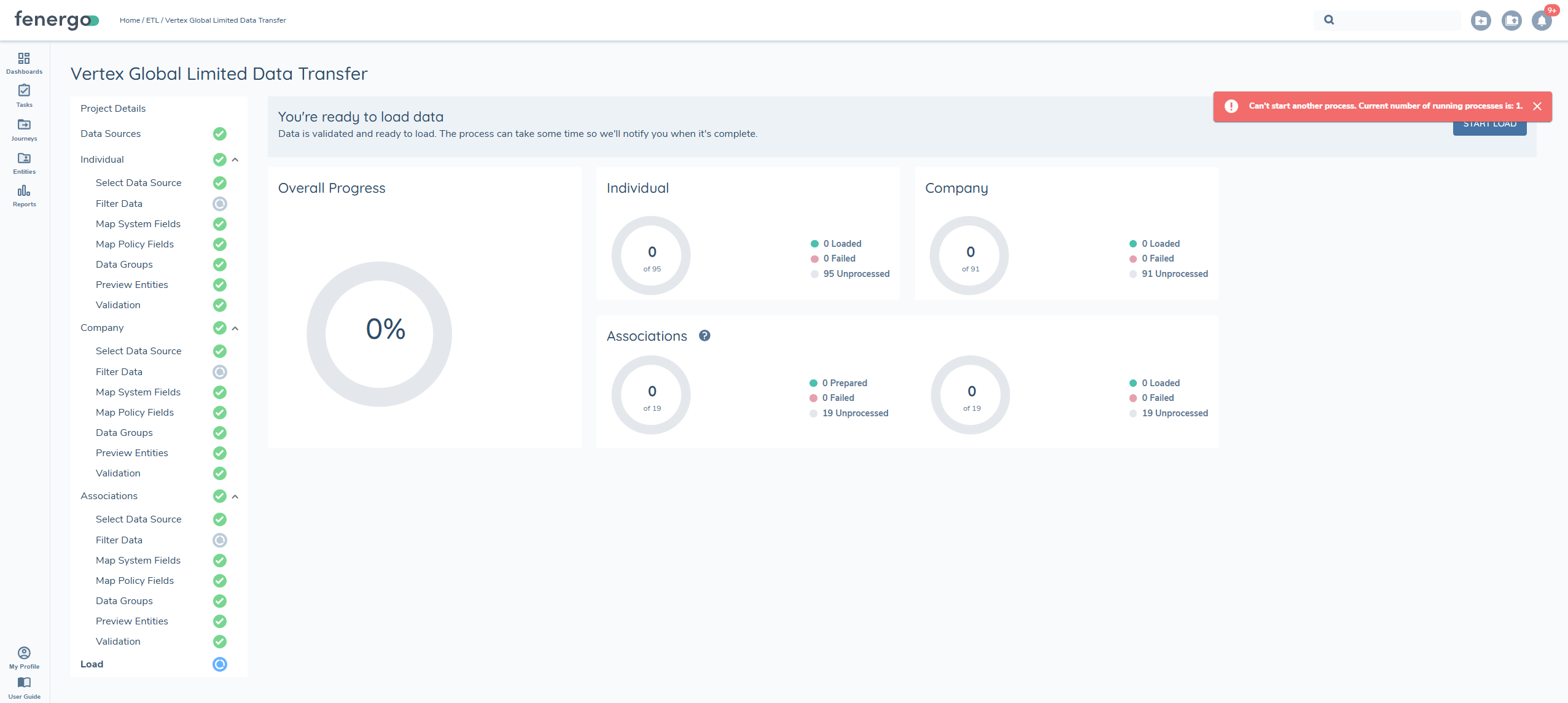 There are limits on the number of loads per tenant that can be active at once. If there is already a load running in your tenant you will see the following message "A load process is already running for this tenant. Please wait for it to complete before starting a new one."