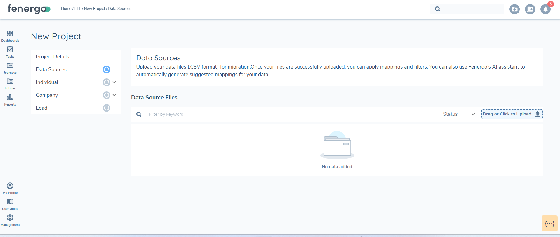 Selecting Confirm will create a new project. This will have no mappings persisted until the datasources are uploaded.