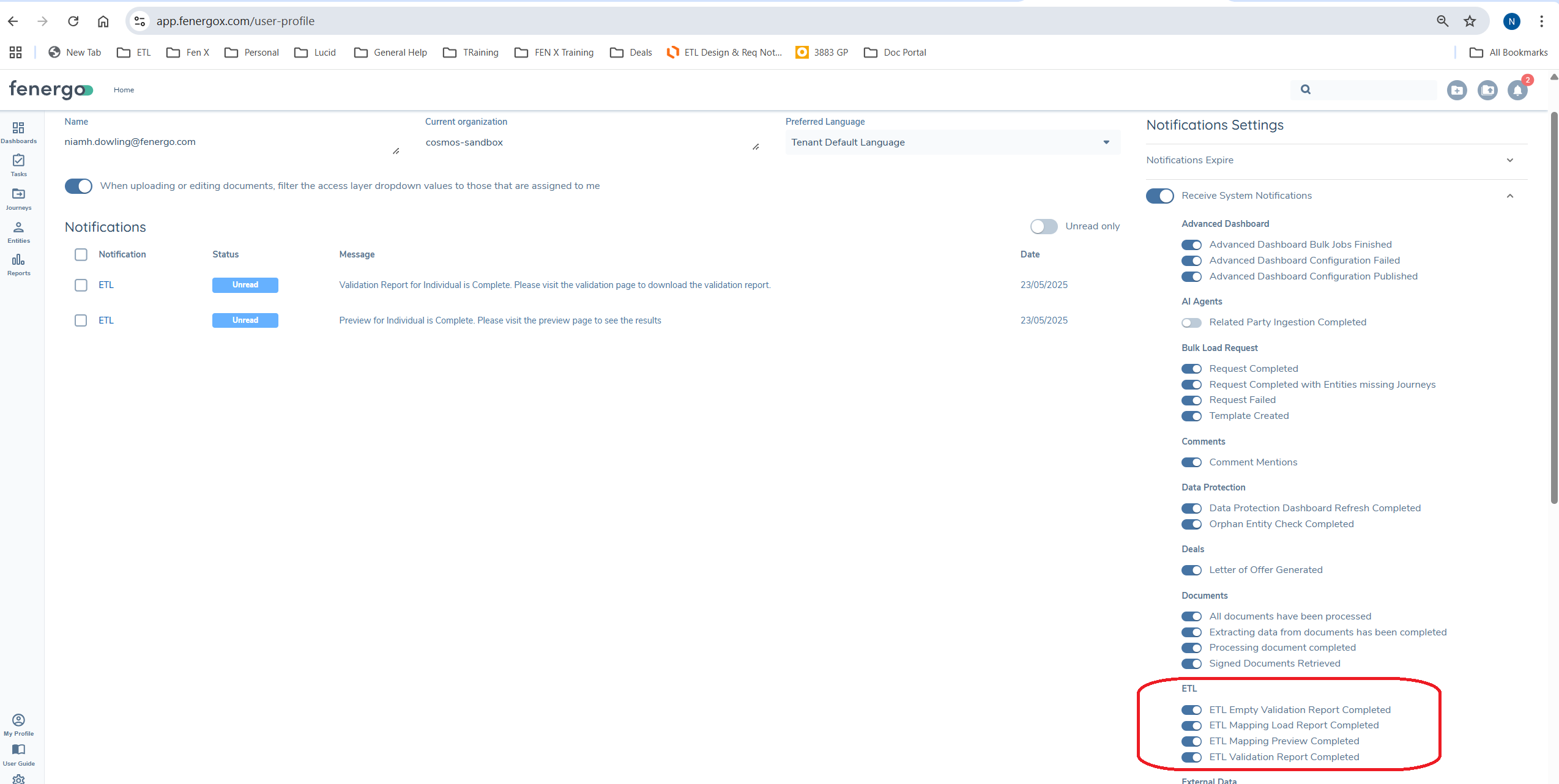 The duration of certain ETL processes can vary depending on the size of your project. To help manage this, users can enable notifications to be alerted when specific processes are complete.Notifications are available for the following ETL processes: