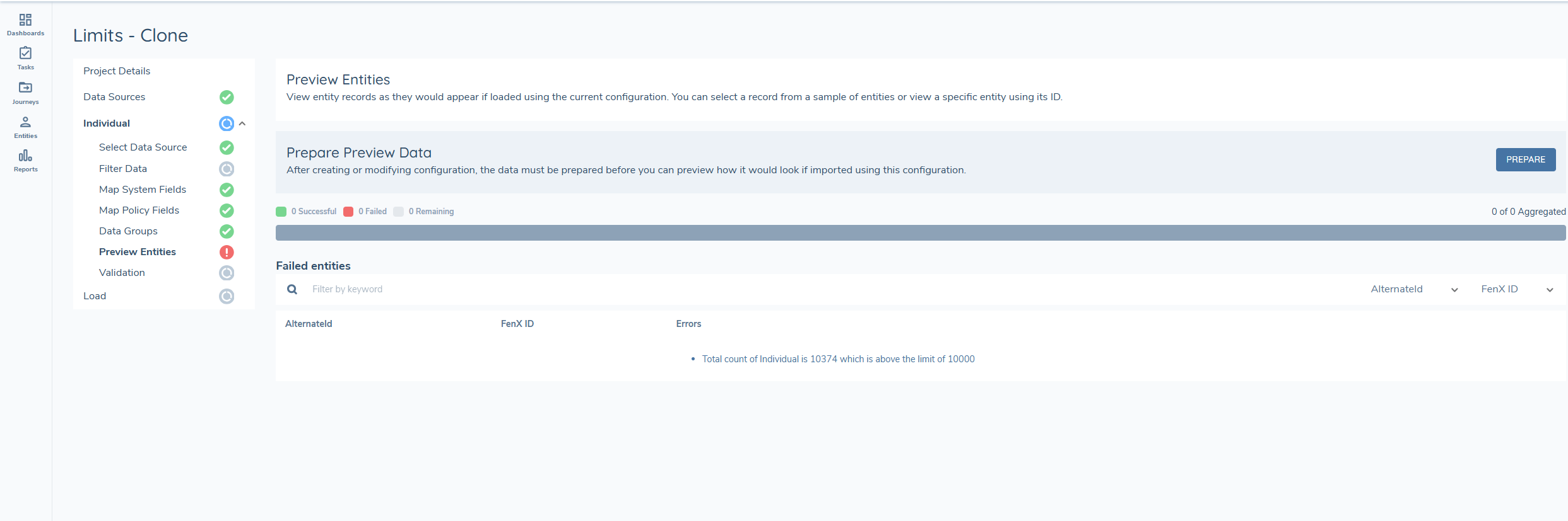 Once a load has successfully passed validation, the likelihood of failures is minimal. However, failures can still occur due to network or cloud resource availability etc. that interrupt the process. In such cases, the load may fail for some entities. These failed entities will appear on the reconciliation report with a status of Failed and a 'Failure Reason' labelled as System error. A new migration must be initiated for the entities that failed.